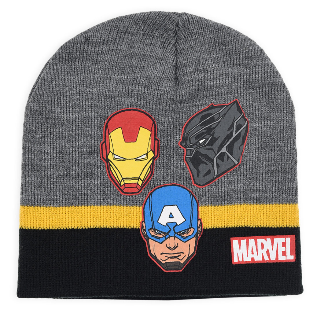 Pletená čepice pro kluky s potiskem Avengers hrdinů od Marvel, v setu s jednobarevnými prstovými rukavicemi.