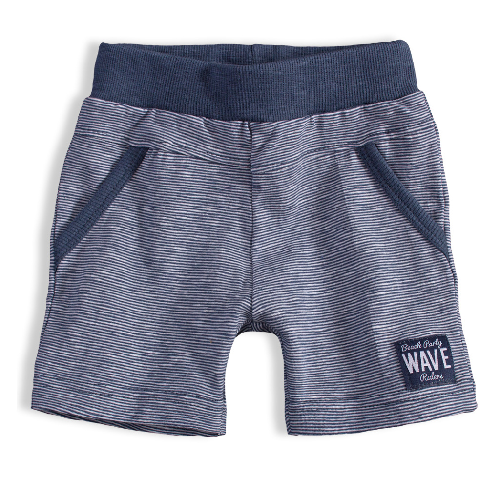 Tričko s krátkým rukávem, s potiskem. Na rameni zapínání na patentky. Kraťásky s nášivkou, v pase do gumy. Falešné kapsy. Pružný úplet.