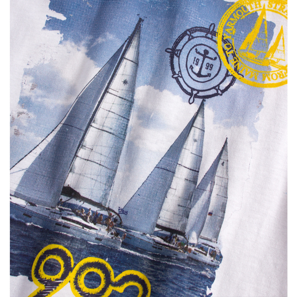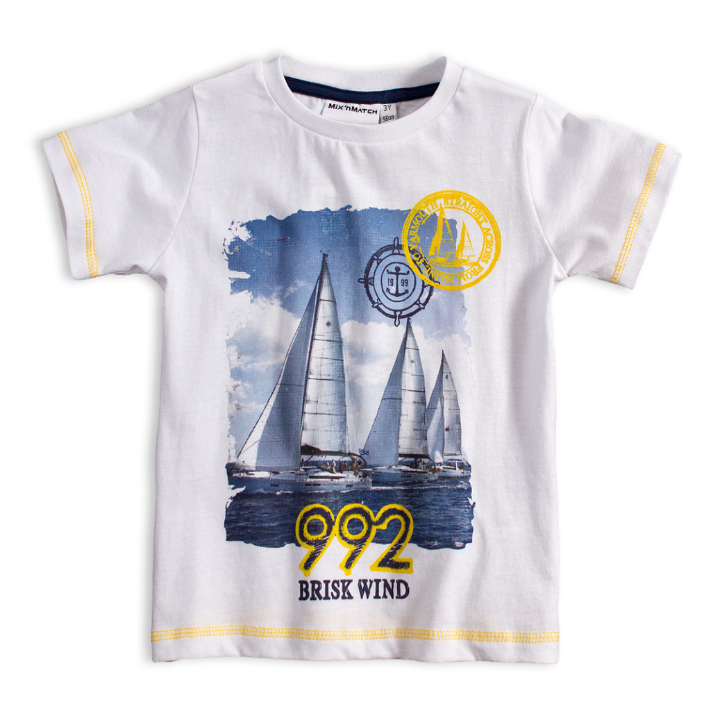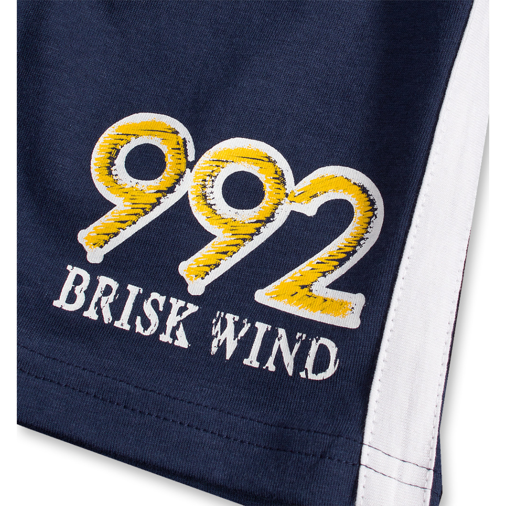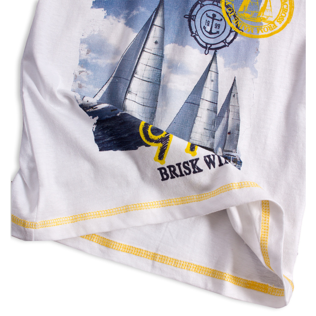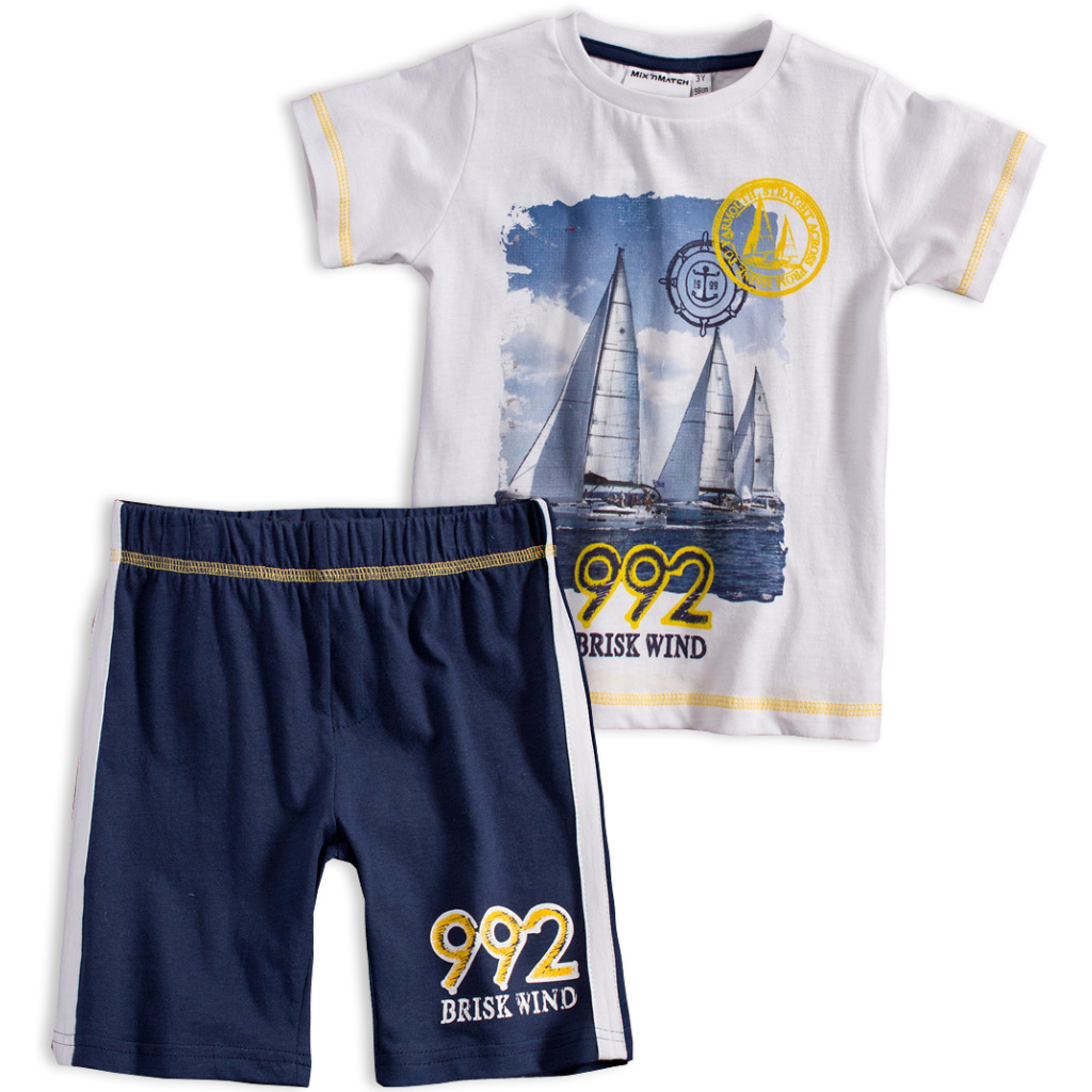 Tričko s krátkým rukávem, potisk plachetnic. Šortky v pase na gumu. Potisk na nohavici, po stranách kontrastní proužky. Příjemný bavlněný úplet.Doplňkové parametry