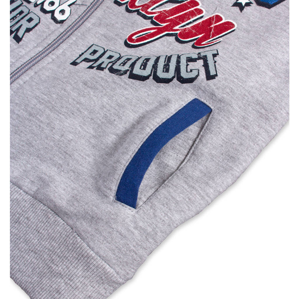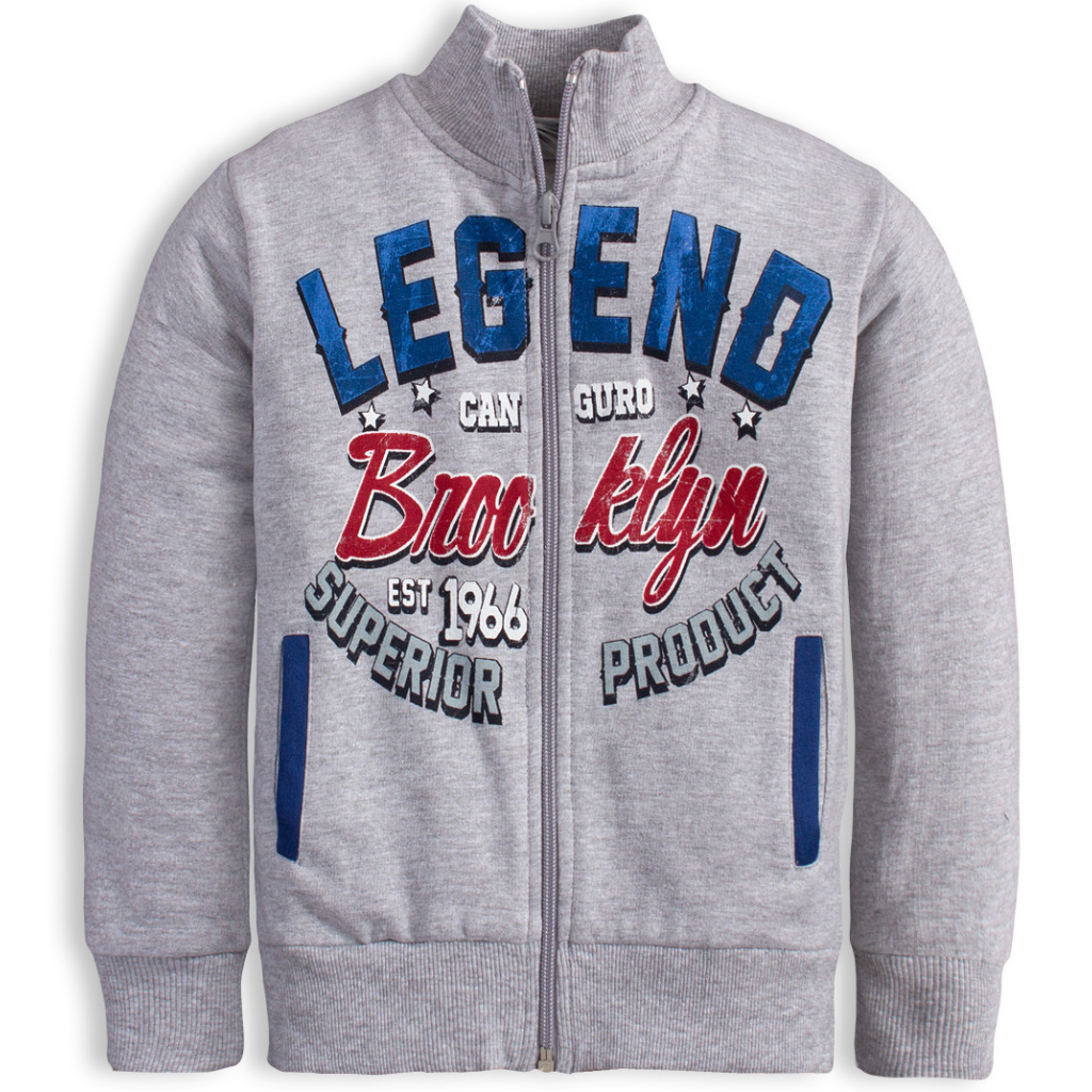 Chlapecká mikina na zip, bez kapuce. U krku stojáček. Vpředu potisk. Funkční kapsy. Pružné lemy. Z rubu jemný chloupek.