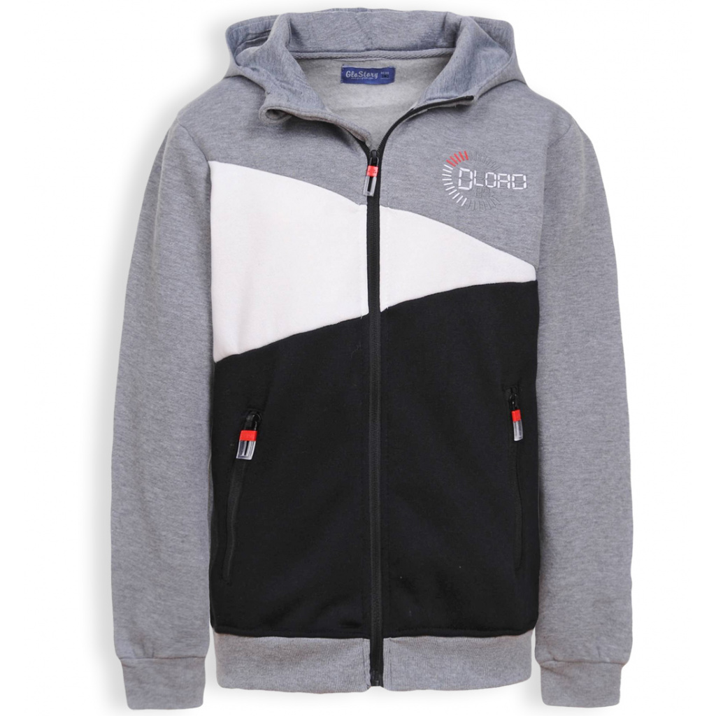 Chlapecká mikina s kapucí. Z hřejivého úpletu s chloupkem na rubové straně. Praktické kapsy na zip.
