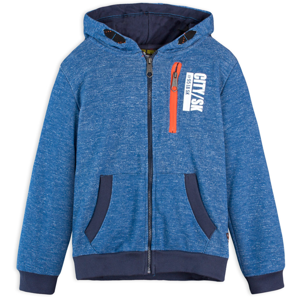Chlapecká mikina s kapucí, našitými kapsami a potiskem. Z boku drobné nášivka, vpředu ozdobná kapsička se zipem. Teplákovina z rubu bez chloupúku.