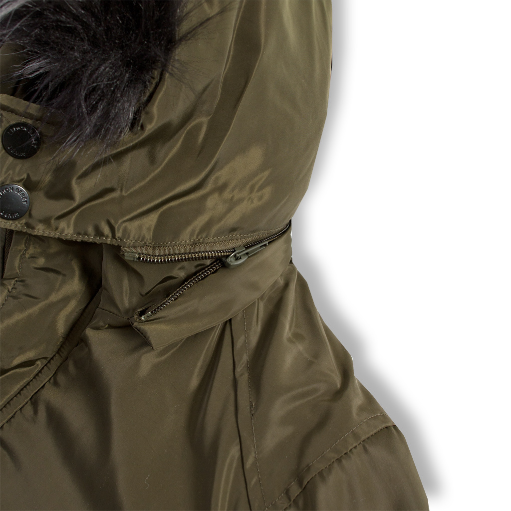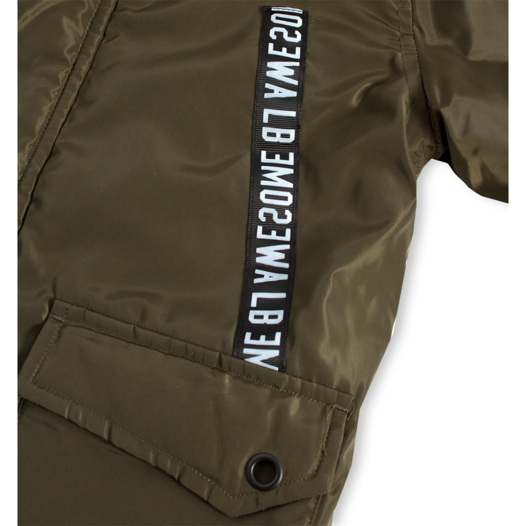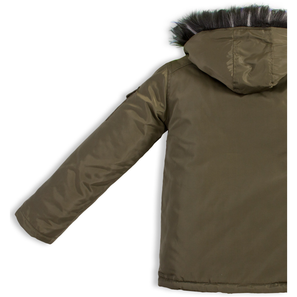 Chlapecká zimní bunda. Delší střih. Odepínací kapuce s kožešinovým lemem. Zapínání na zip krytý légou s patenty. Vpředu našité kapsy. Rukávy s vnitřním pružným lemem. Prošívaná šusťáková podšívka.