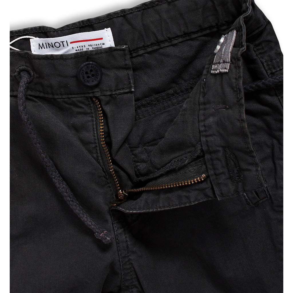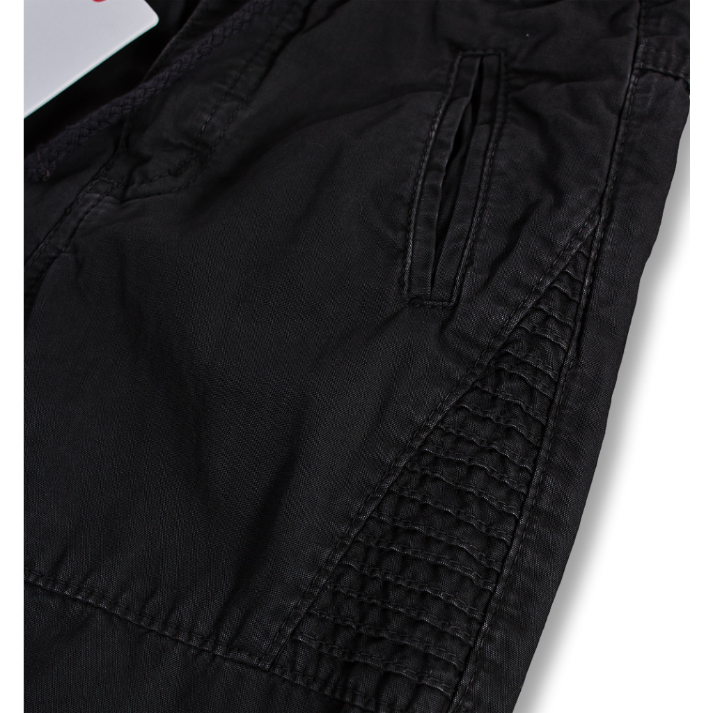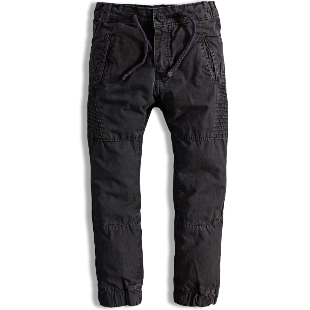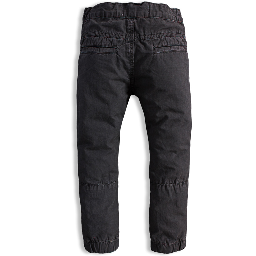 Chlapecké kalhoty z pevného plátna. V pase zip a knoflík, stahovací guma. Tkaničky ozdobné. Funkční kapsy vpředu i vzadu. Nohavice do gumy.