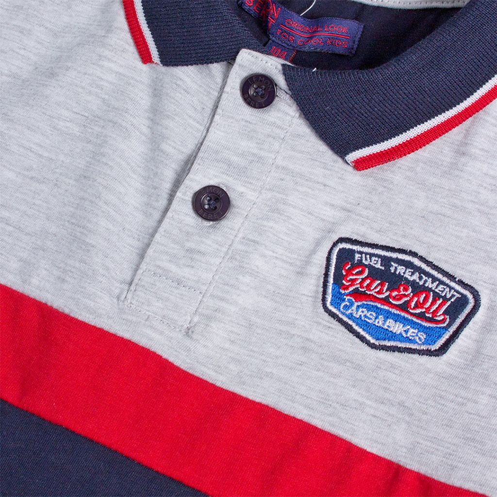 Chlapecké tričko s límečkem, s knoflíčky. Příjemný bavlněný úplet. Vpředu nášivka, na bocích rozparky.