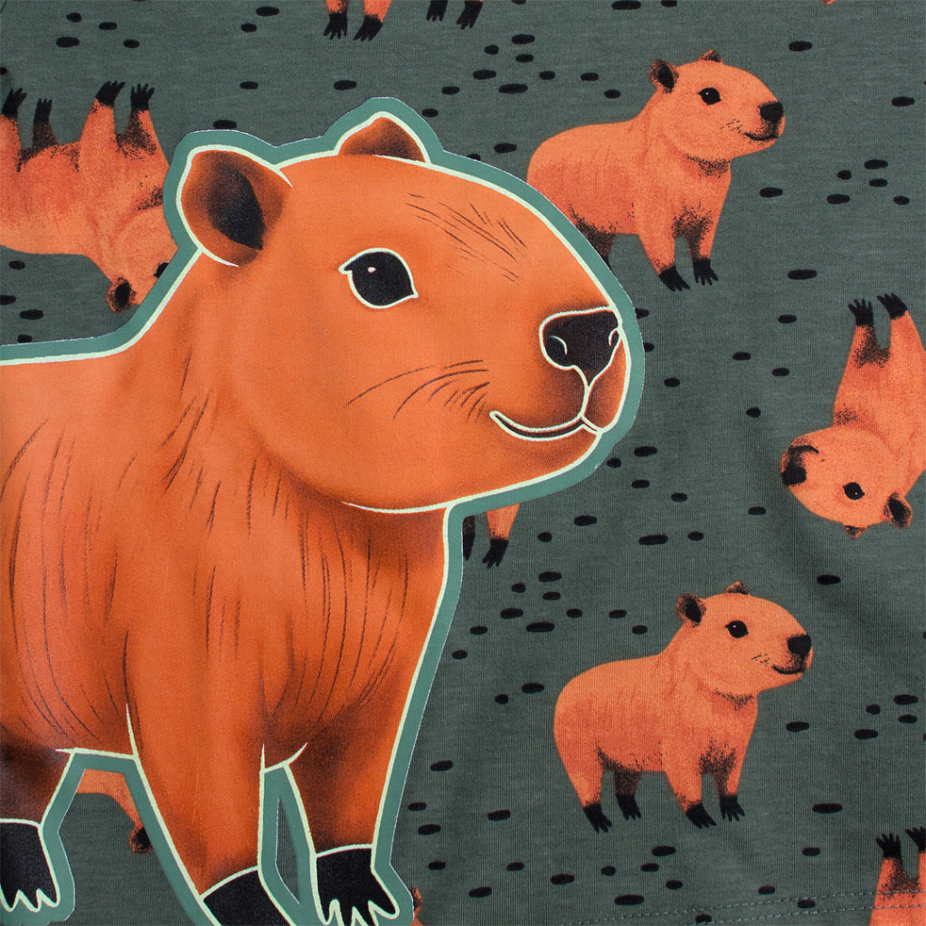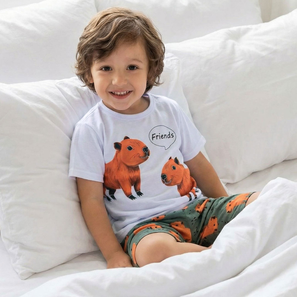 Chlapecké pyžamo s kapybarami. Obrys obrázku na tričku ve tmě svítí. Krátké rukávy i nohavice. Bavlněný úplet. Vyrobeno v Brazílii.