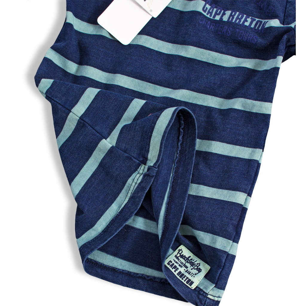 Chlapecké tričko s krátkým rukávem. Lehký, pružný úplet s proužkem. Vpředu nenápadný potisk, dole malá nášivka.