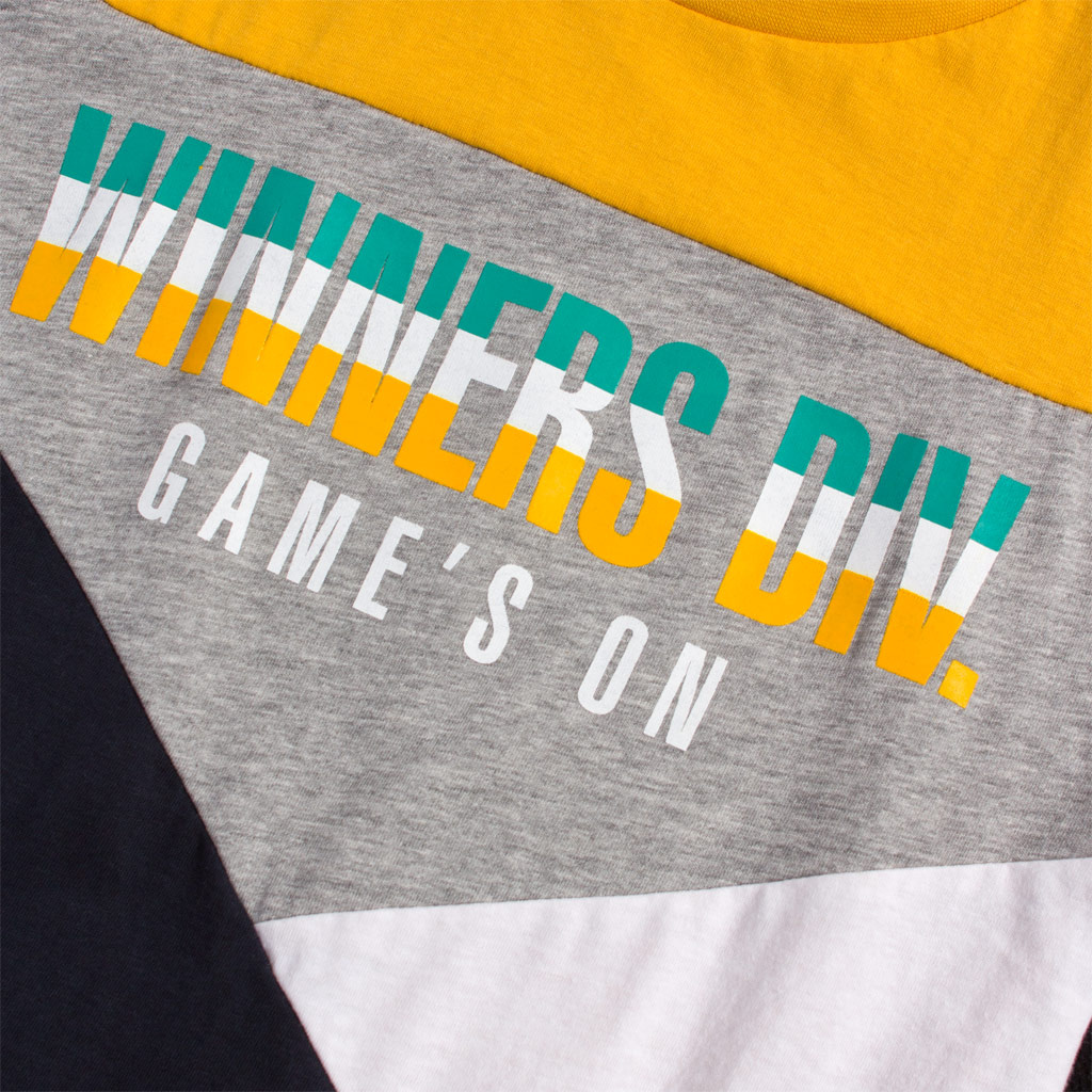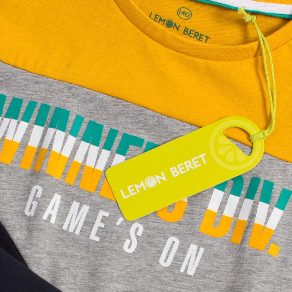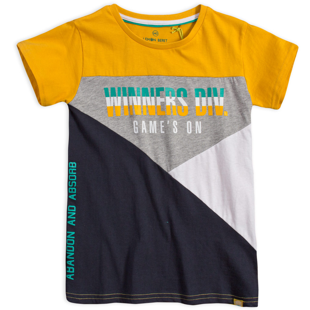 Chlapecké tričko s krátkým rukávem, s nápisem. Vpředu kombinace barevných úpletů, zadní díl jednobarevný. Příjemný, pružný materiál.