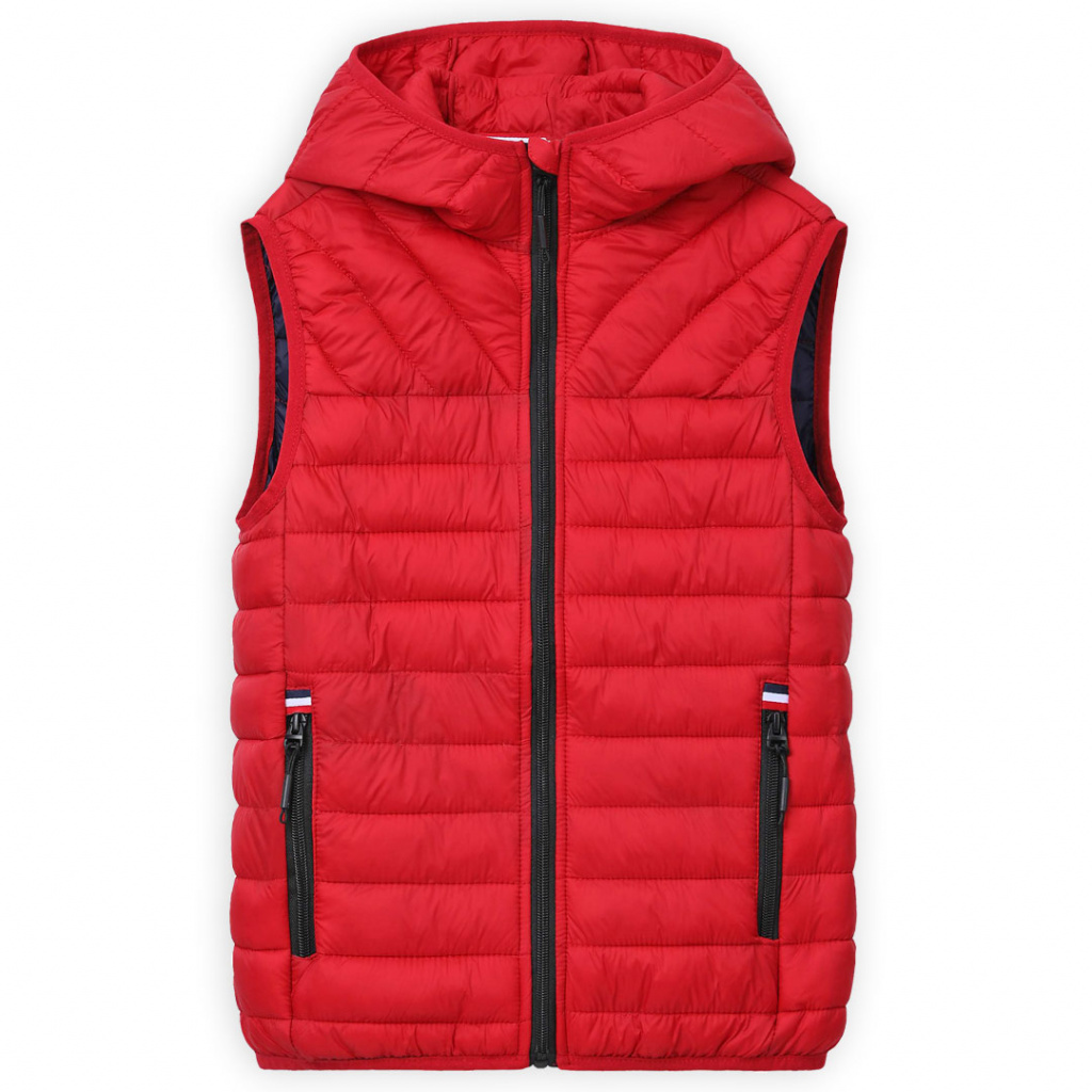 Dětská lehoučká vesta pro přechodné období. Měkký, příjemný materiál. Dvě kapsy na zip, kapuce, u krku stojáček.