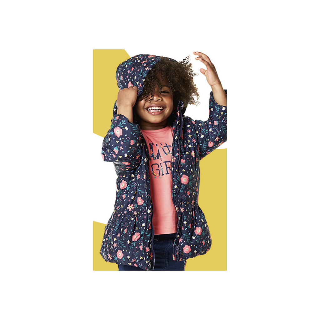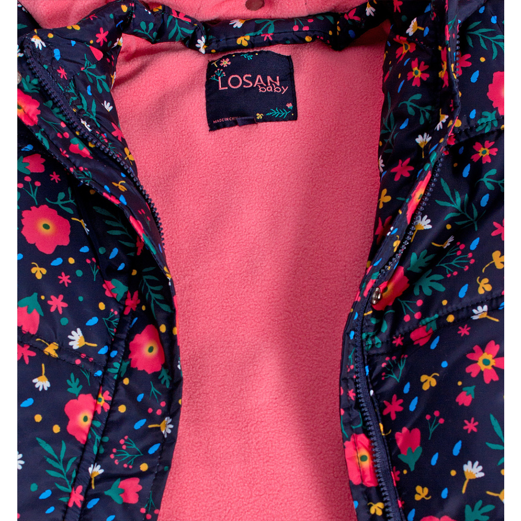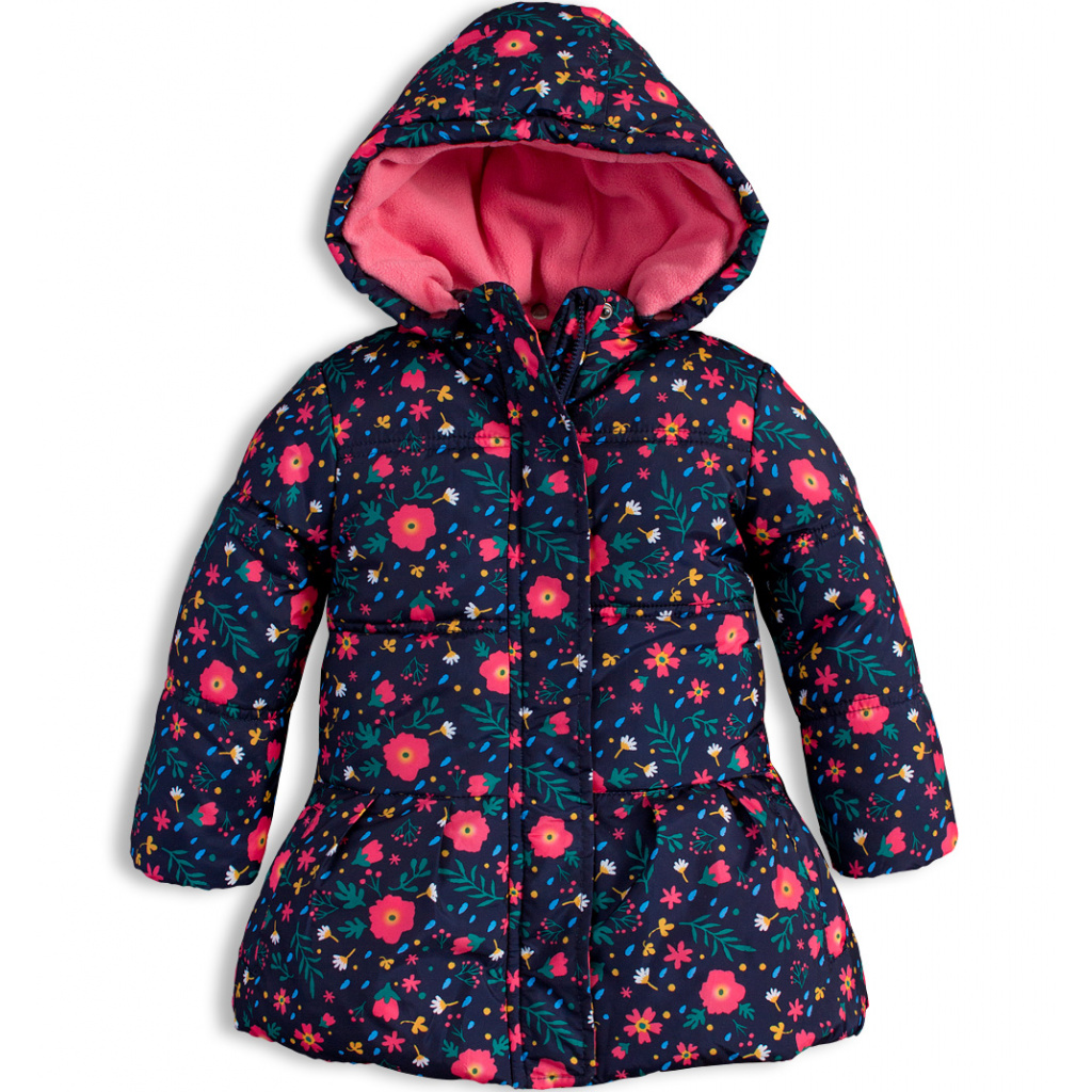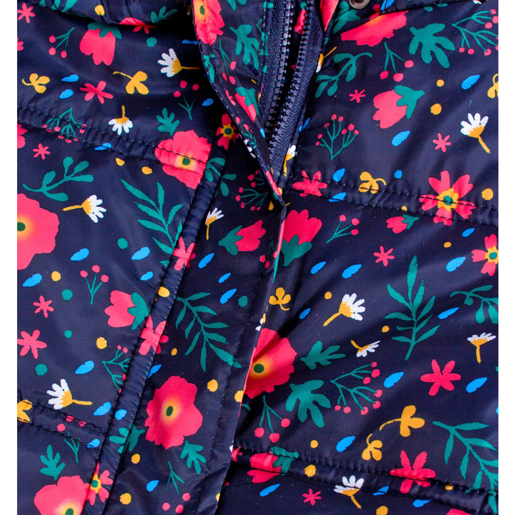 Zimní bunda pro holčičky. Šusťák s potiskem kytiček. Odepínací kapuca. Všité kapsy. Spodní část mírně rozšířená. Praktický delší střih. Fleecová podšívka. V rukávech šusťák pro snadné oblékání.Doplňkové parametry