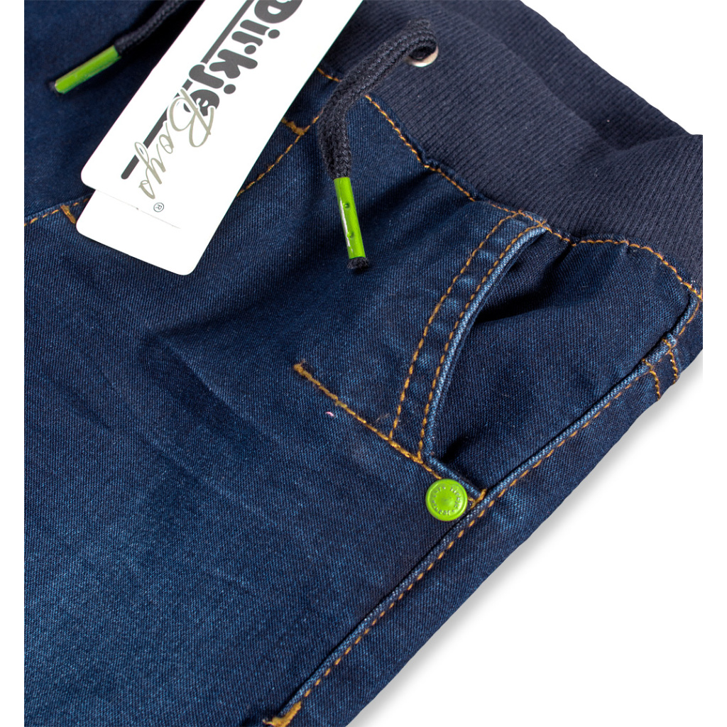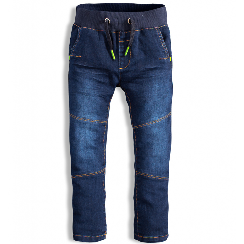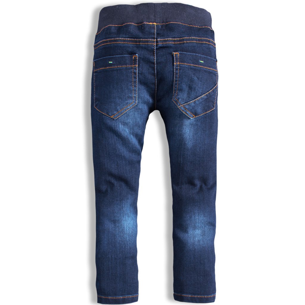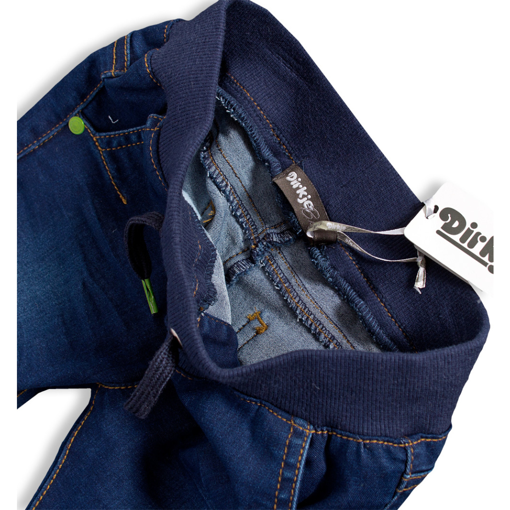 Chlapecké kalhoty z tmavé džínoviny. V pase guma, tkanička přišitá. Vpředu i vzadu kapsy. Ozdobné prošití na přední straně nohavic. Měkká džínovina s podílem elastanu.