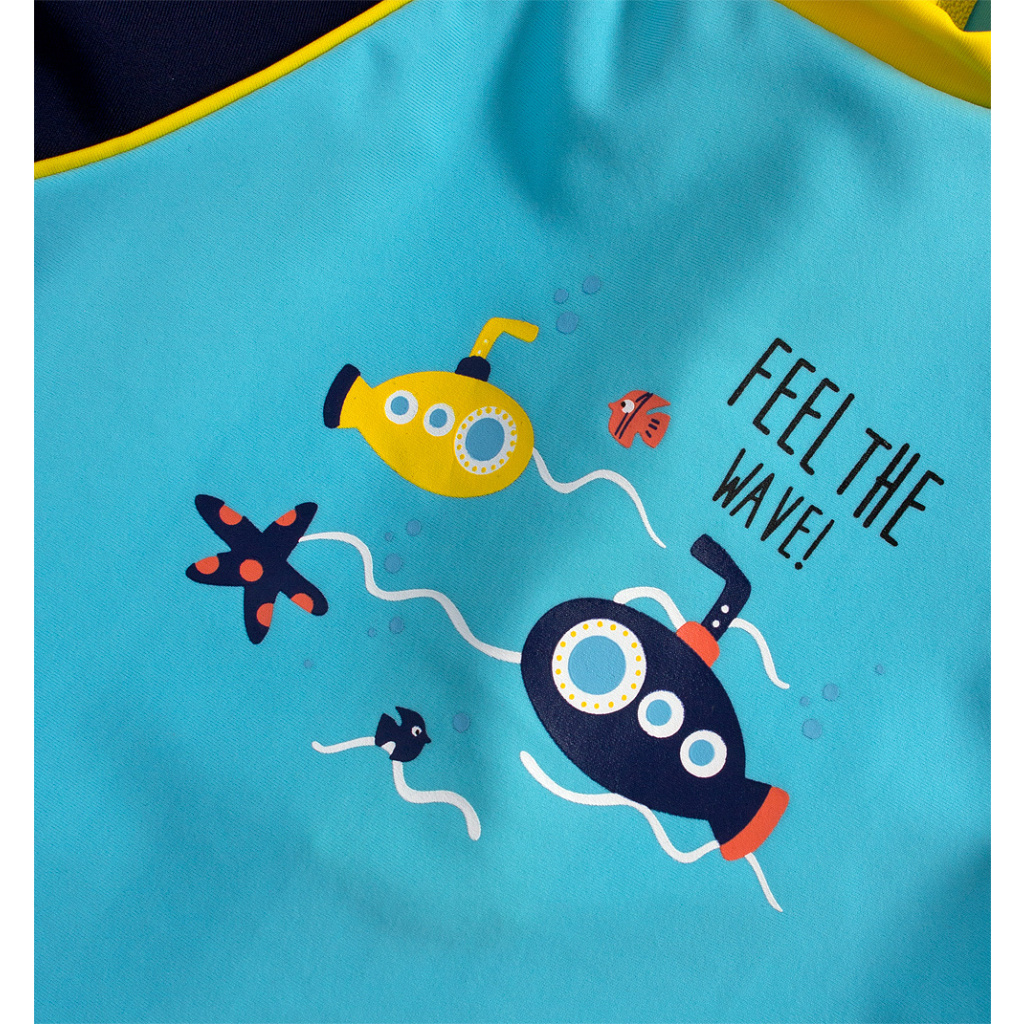 Dětské plavky. Vrchní díl - tričko, vzadu zapínání na zip. Spodní díl s krátkou nohavičkou. Praktická kombinace, ochrání před slunečními paprsky. Syté barvy, barevný potisk.Doplňkové parametry