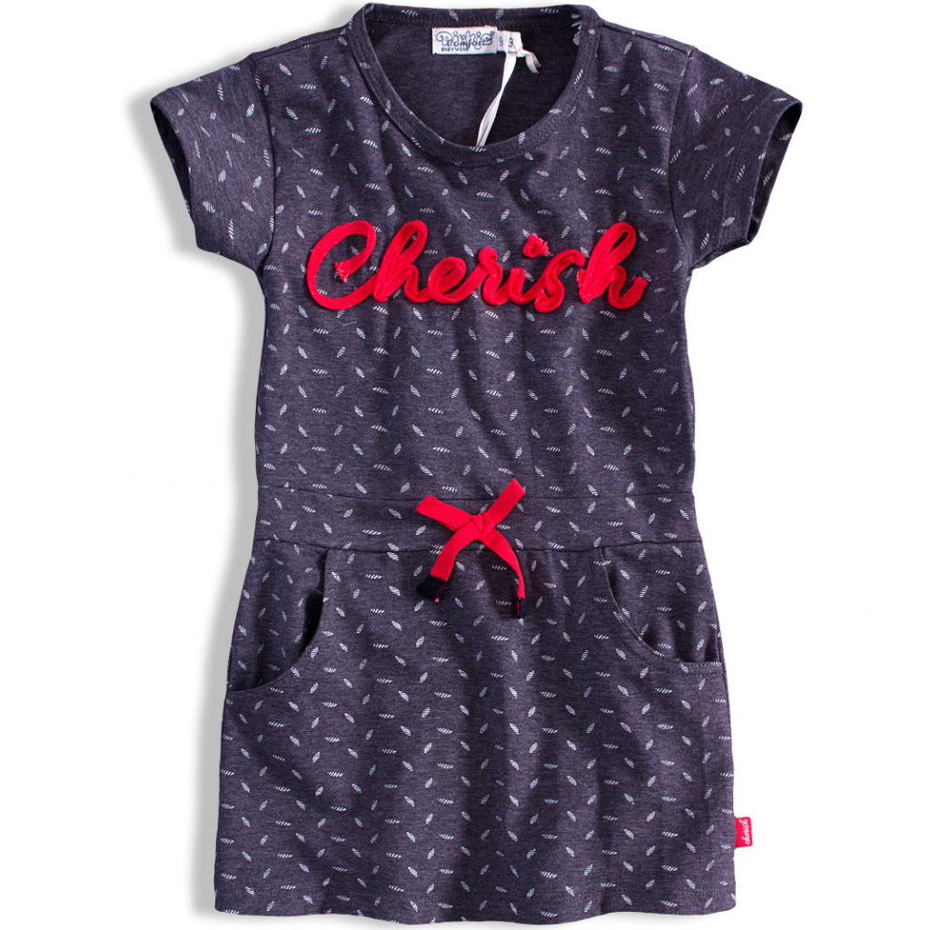 Dívčí šatičky s krátkým rukávem. Vpředu našitý nápis a mašlička. Kapsy. Příjemný, pružný úplet s drobným potiskem.Doplňkové parametry