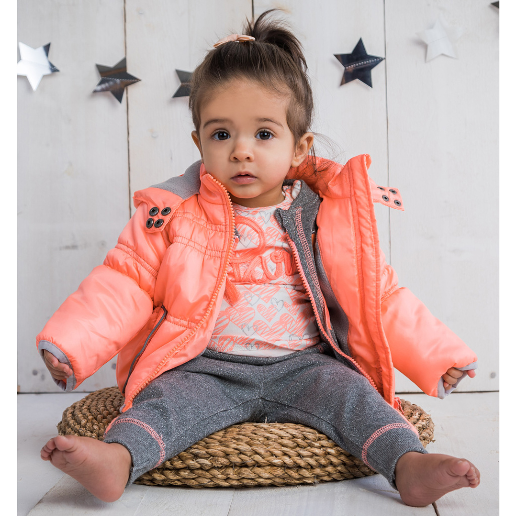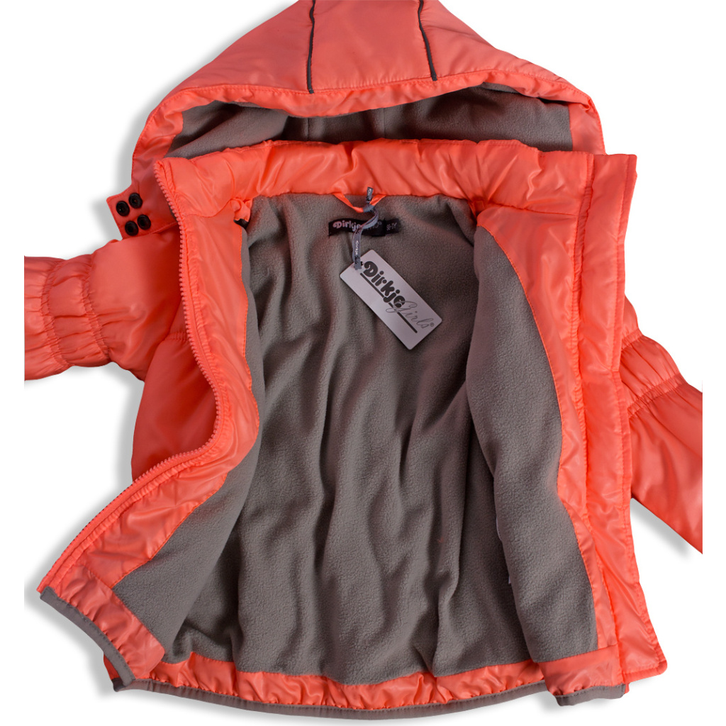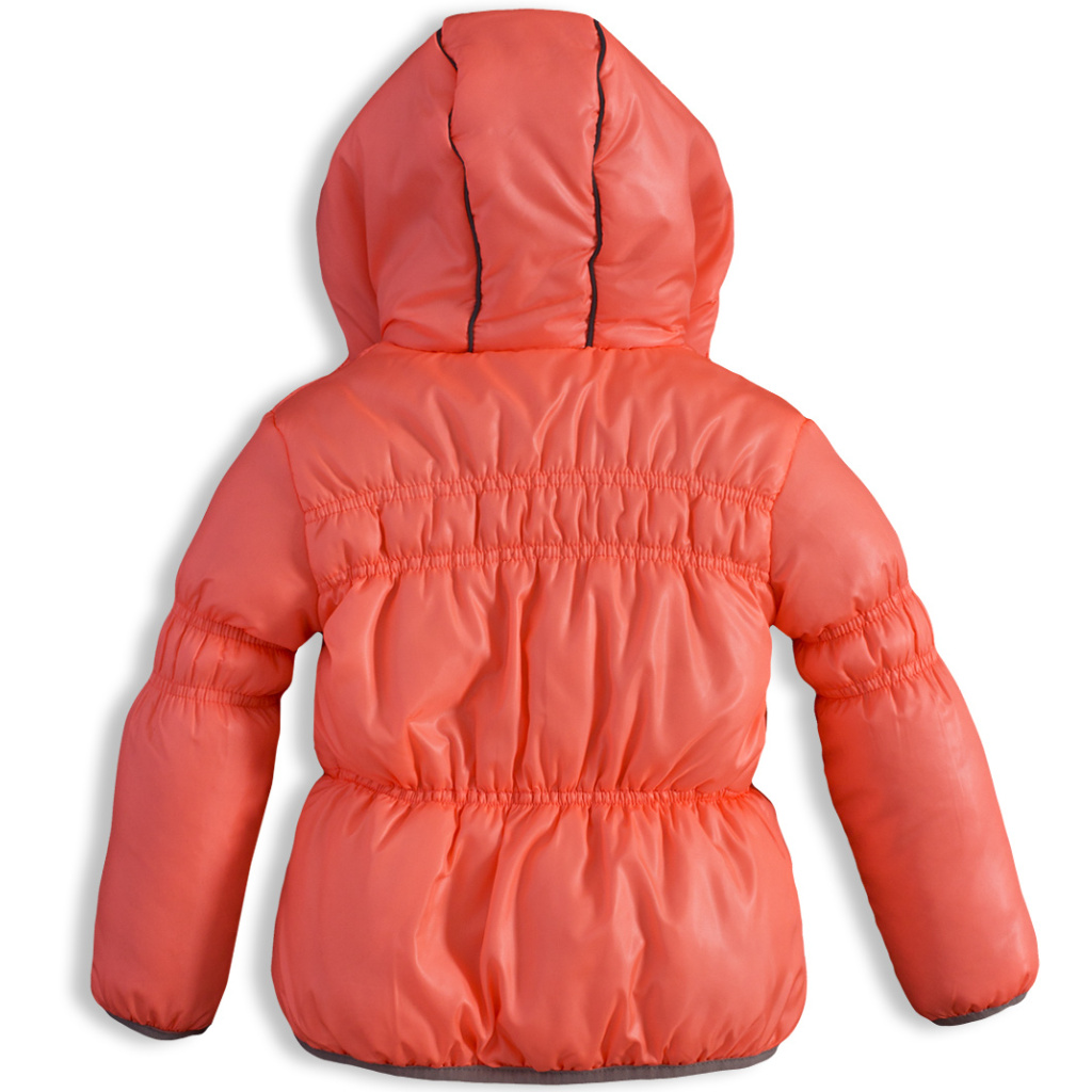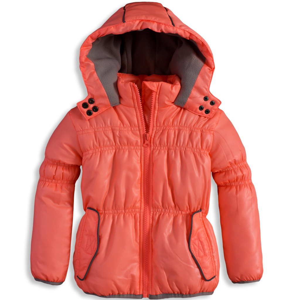 Dívčí zimní bunda s kapucí se zapínáním, u krku stojáček. Vpředu zapínací kapsy. Prošití jemnými gumičkami. Na těle fleecová podšívka.