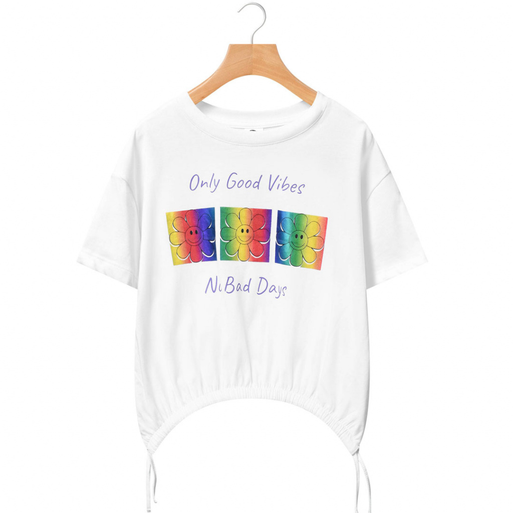 Dívčí tričko - volnější crop top s barevným potiskem. Spodní okraj lze stáhnout tkaničkou. Příjemný, pružný materiál.