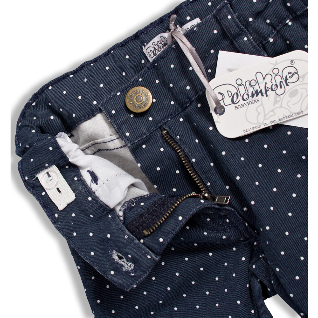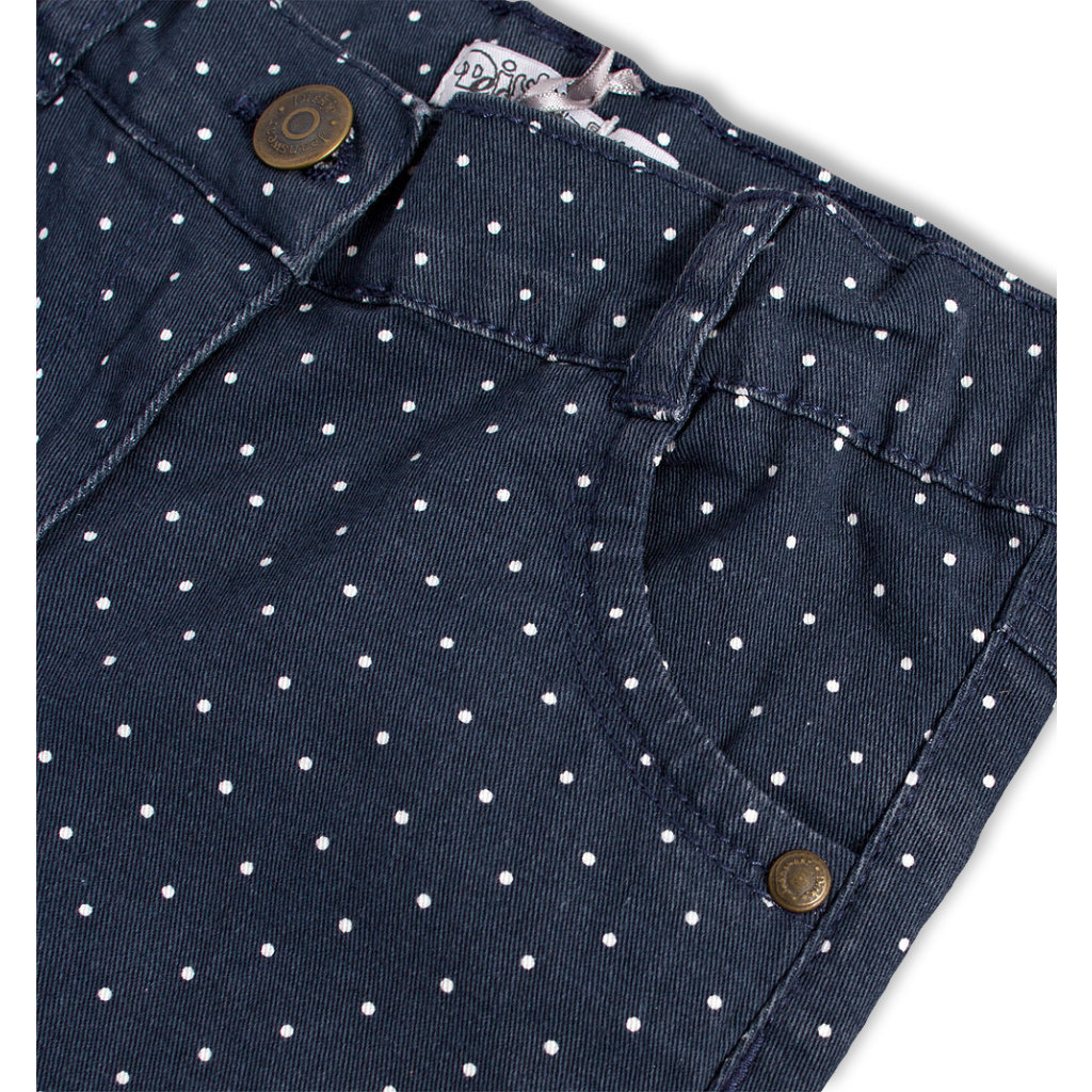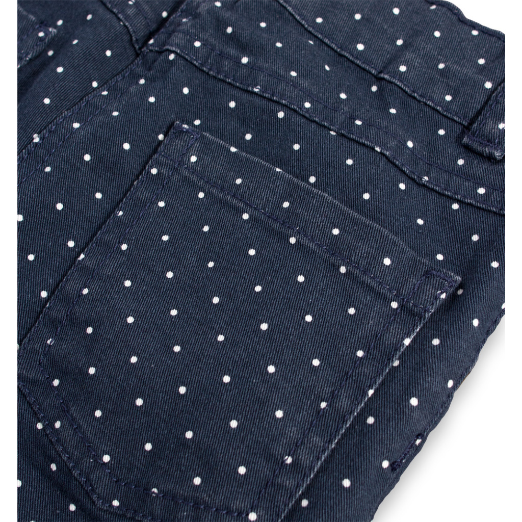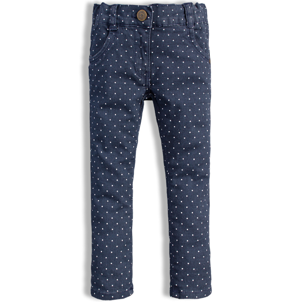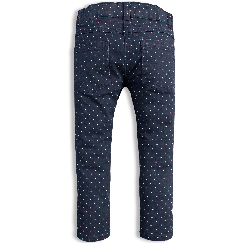 Dívčí džíny z tmavé džínoviny s elastanem, s drobnými puntíky. V pase knoflík, zip, stahovací guma. Kapsy vpředu i vzadu.