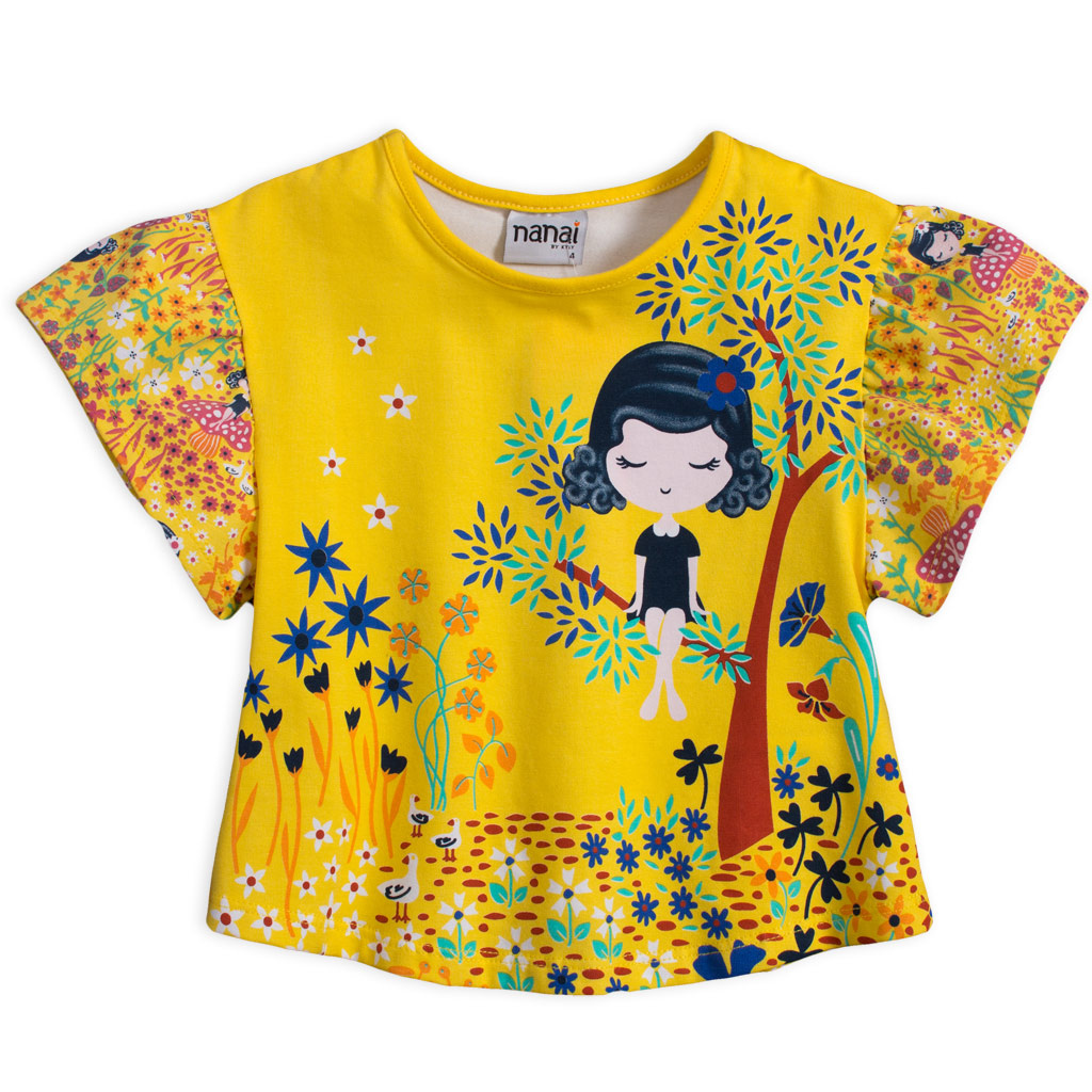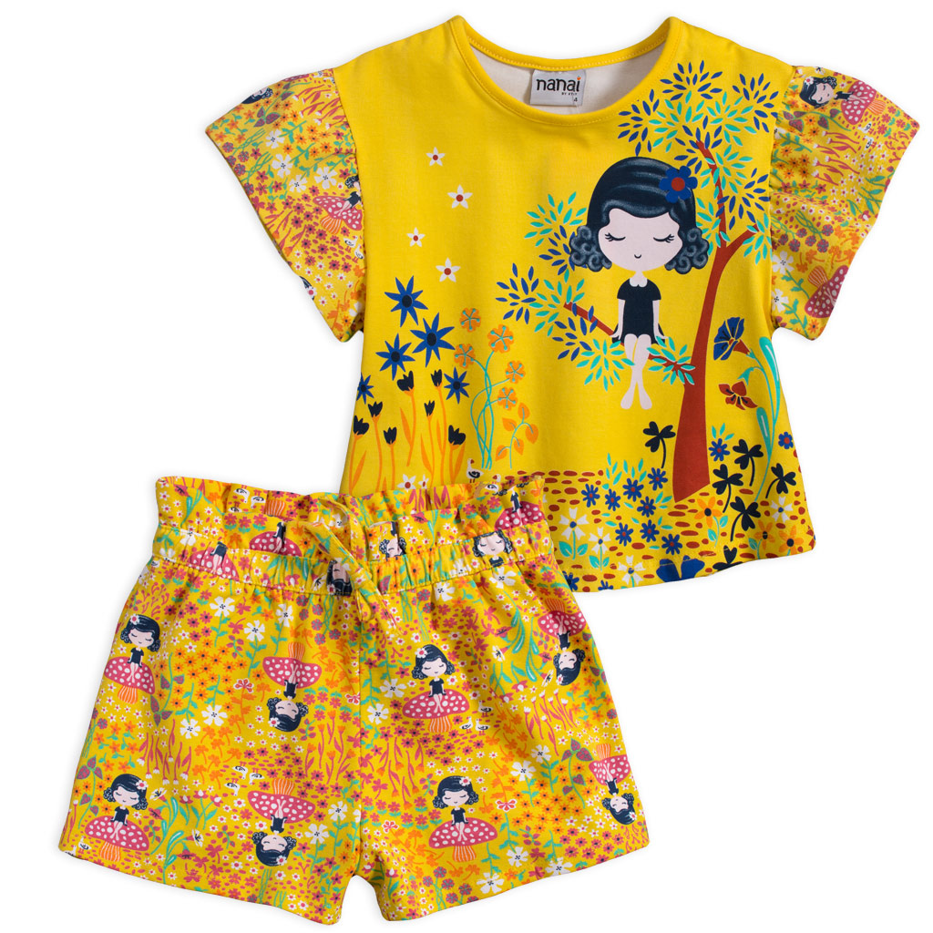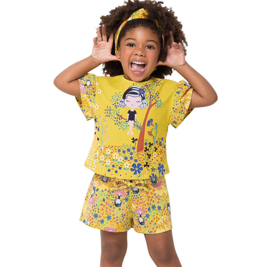 Krásný letní komplet pro holčičky. Brazilská módní značka. Tričko s volnějším krátkým rukávem, kratší střih. Šortky v pase na gumu, s ozdobnou mašličkou. Výrazné barvy. Příjemný materiál.