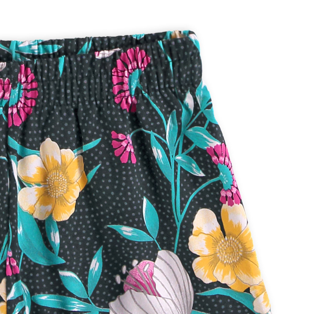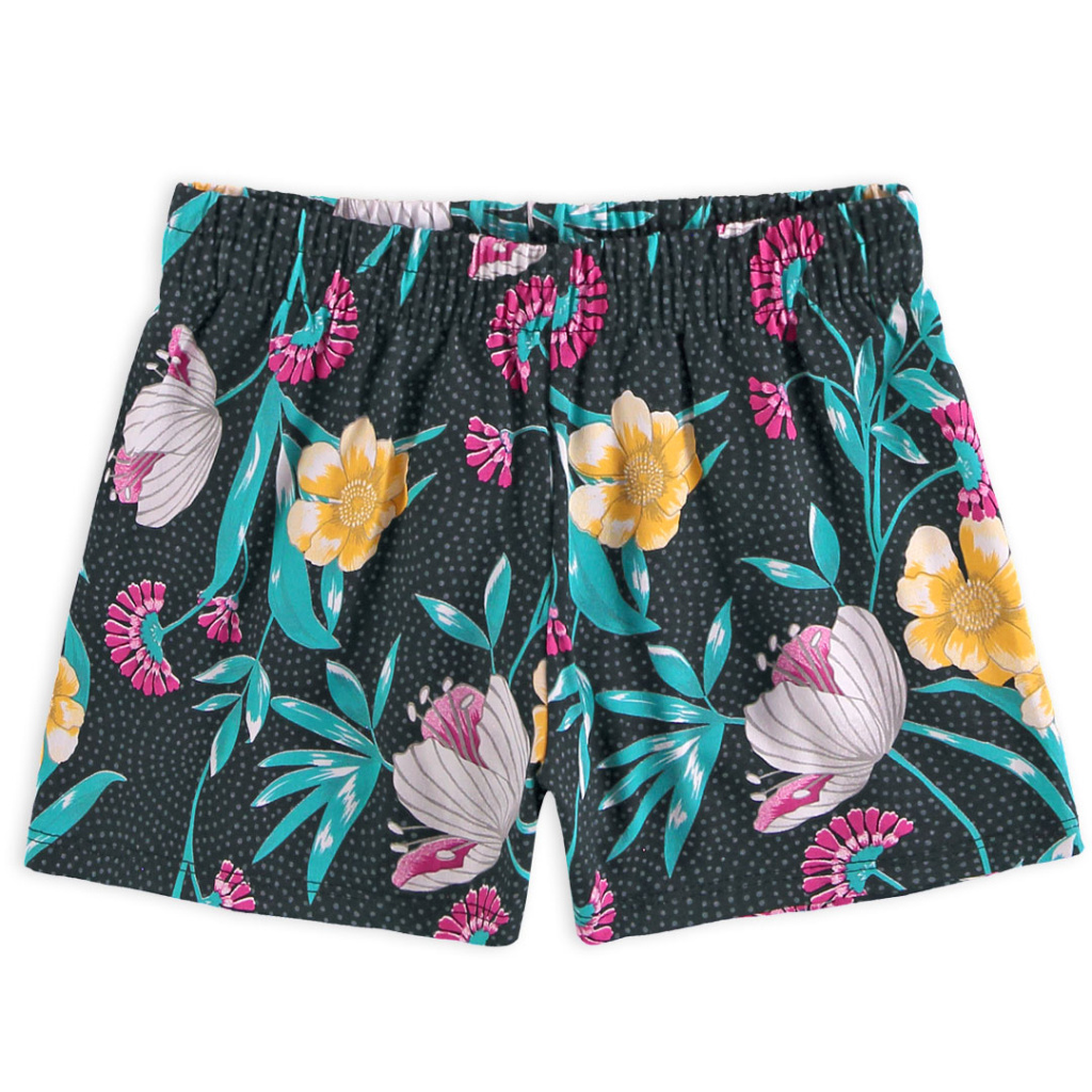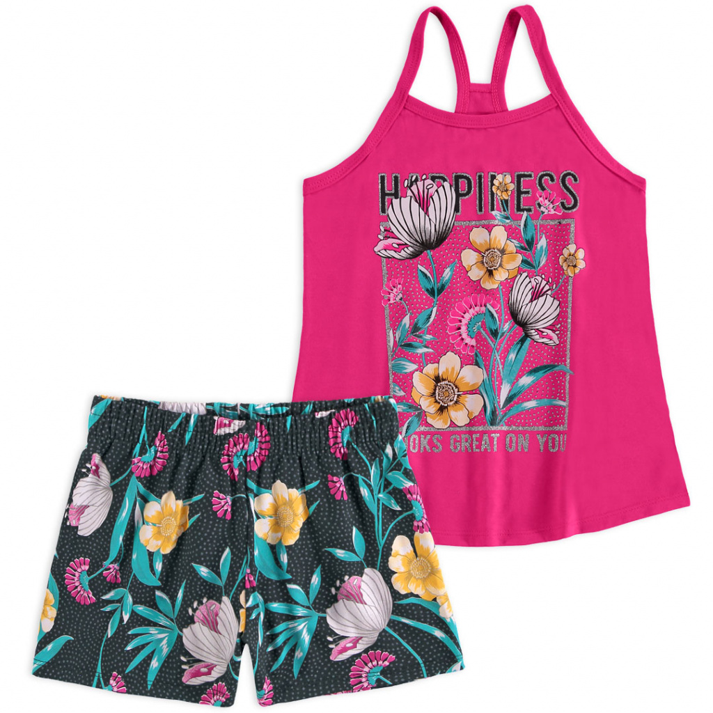 Dívčí letní souprava. Tílko s potiskem, se stříbrnými detaily, rozšířený střih. Pohodlné, pružné šortky, v pase na gumu. Vyrobeno v Brazílii.