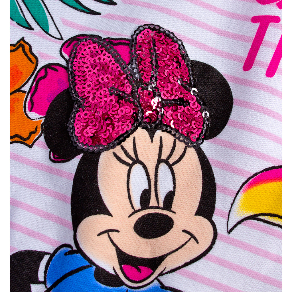 Letní šatičky s myškou Minnie. Krátký rukávek, pohodlý úplet z kvalitní bavlny, skvělé do teplých letních dnů. Mašlička z našitých flitrů.