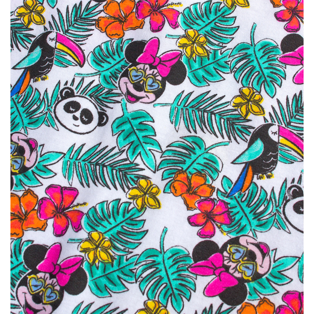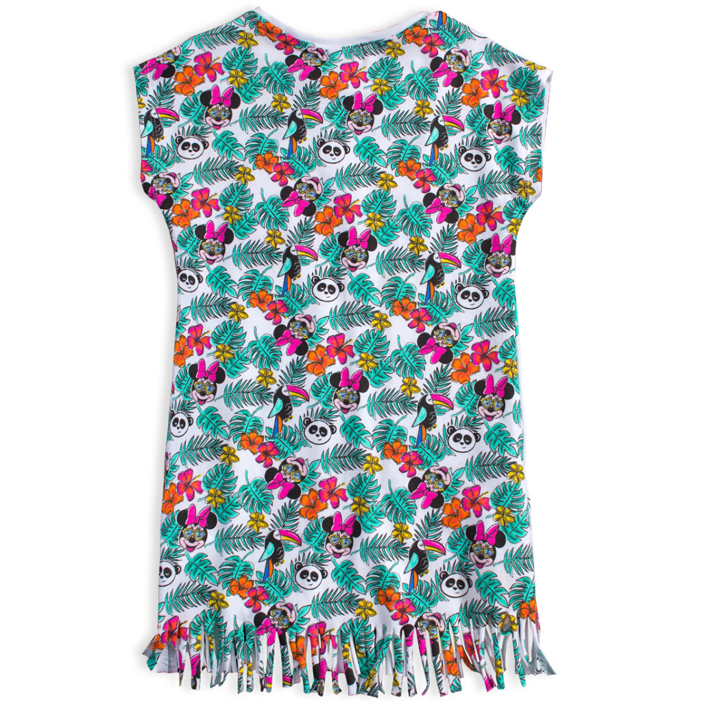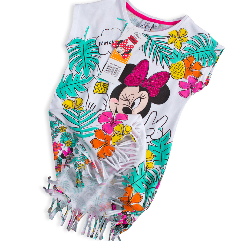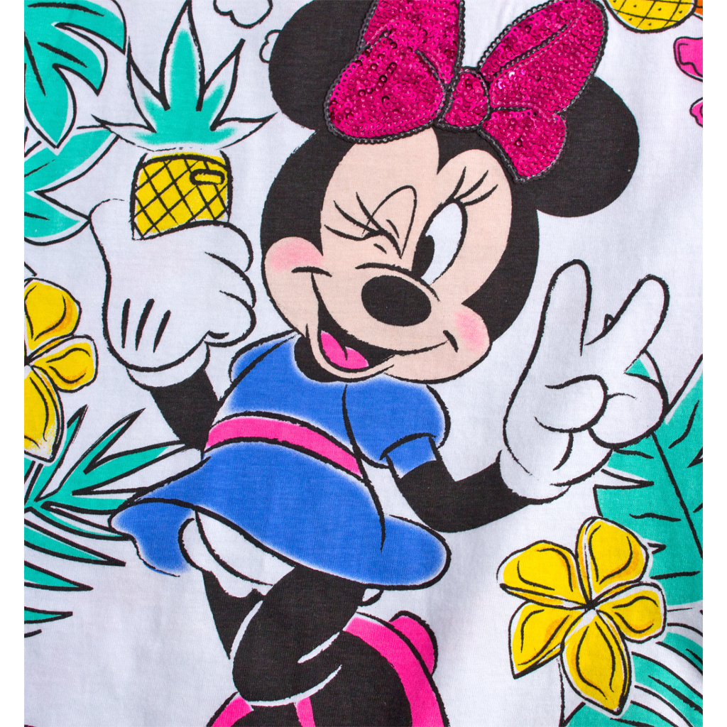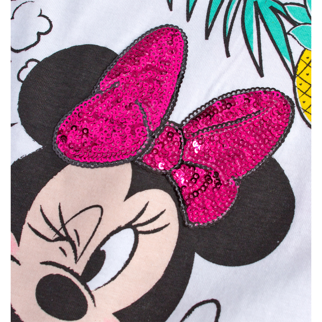 Letní šatičky s myškou Minnie. Krátký rukávek, pohodlný úplet z kvalitní bavlny, skvělé do teplých letních dnů. Mašlička z našitých flitrů, zadní díl s barevným potiskem.