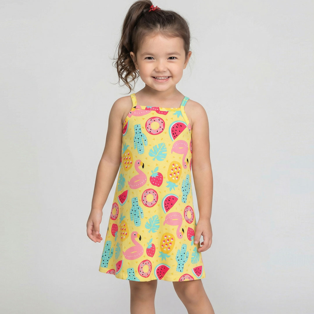 Dívčí šaty bez rukávů, s úzkými ramínky. Rozšířený střih. Měkký, pohodlný, bavlněný úplet s barevným potiskem. Vyrobeno v Brazílii.