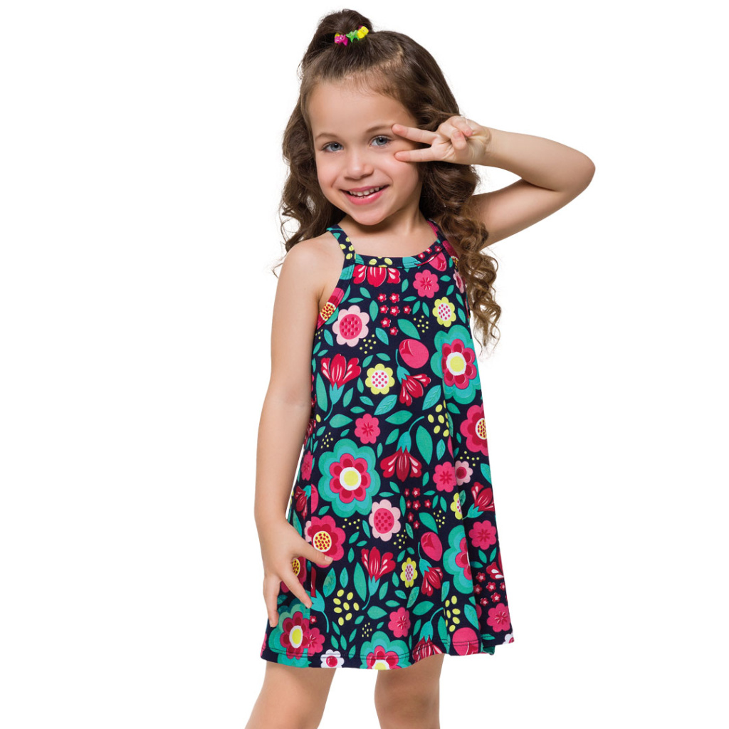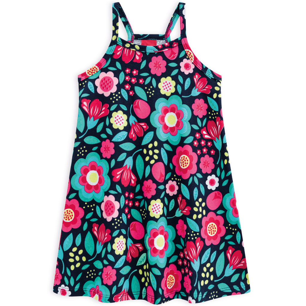 Dívčí letní šaty bez rukávů, s úzkými ramínky. Nádherně barevný potisk na bavlněném úpletu.