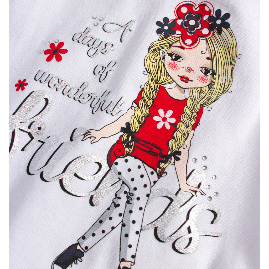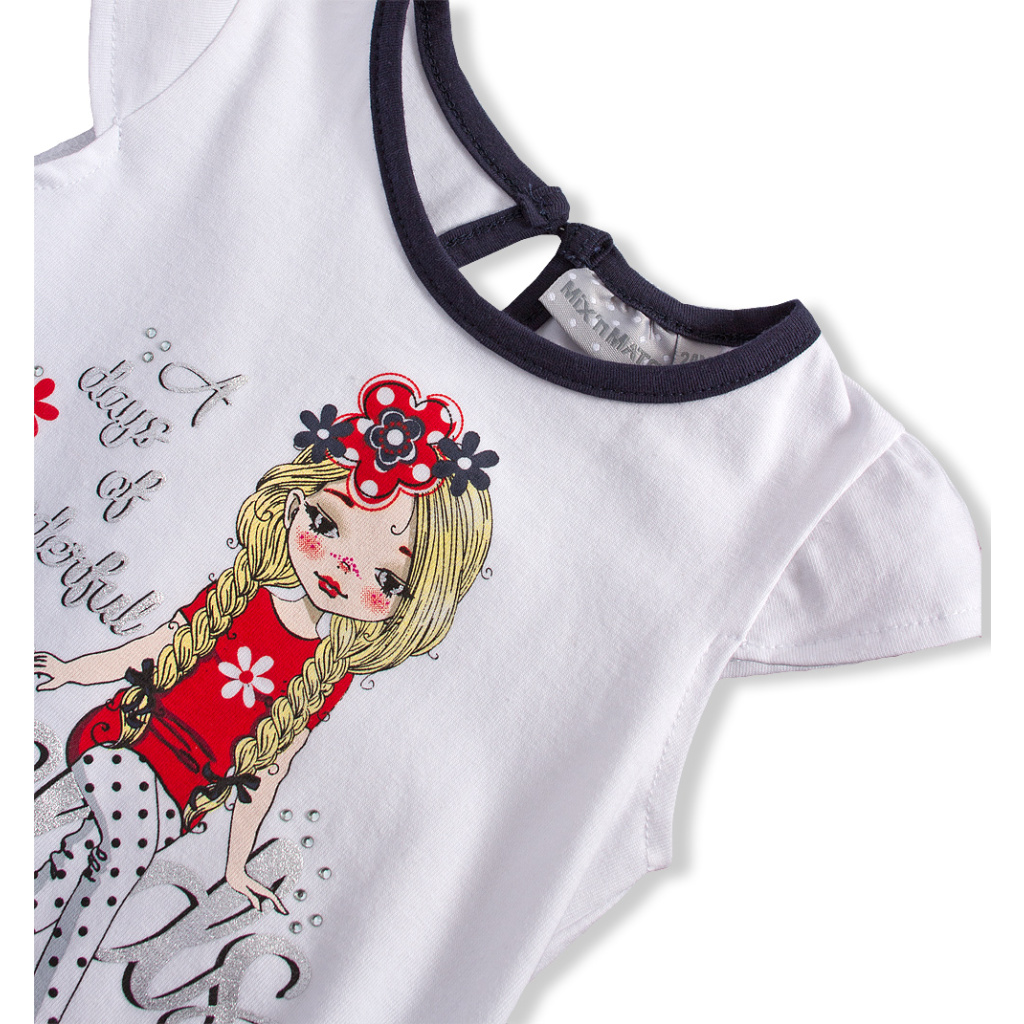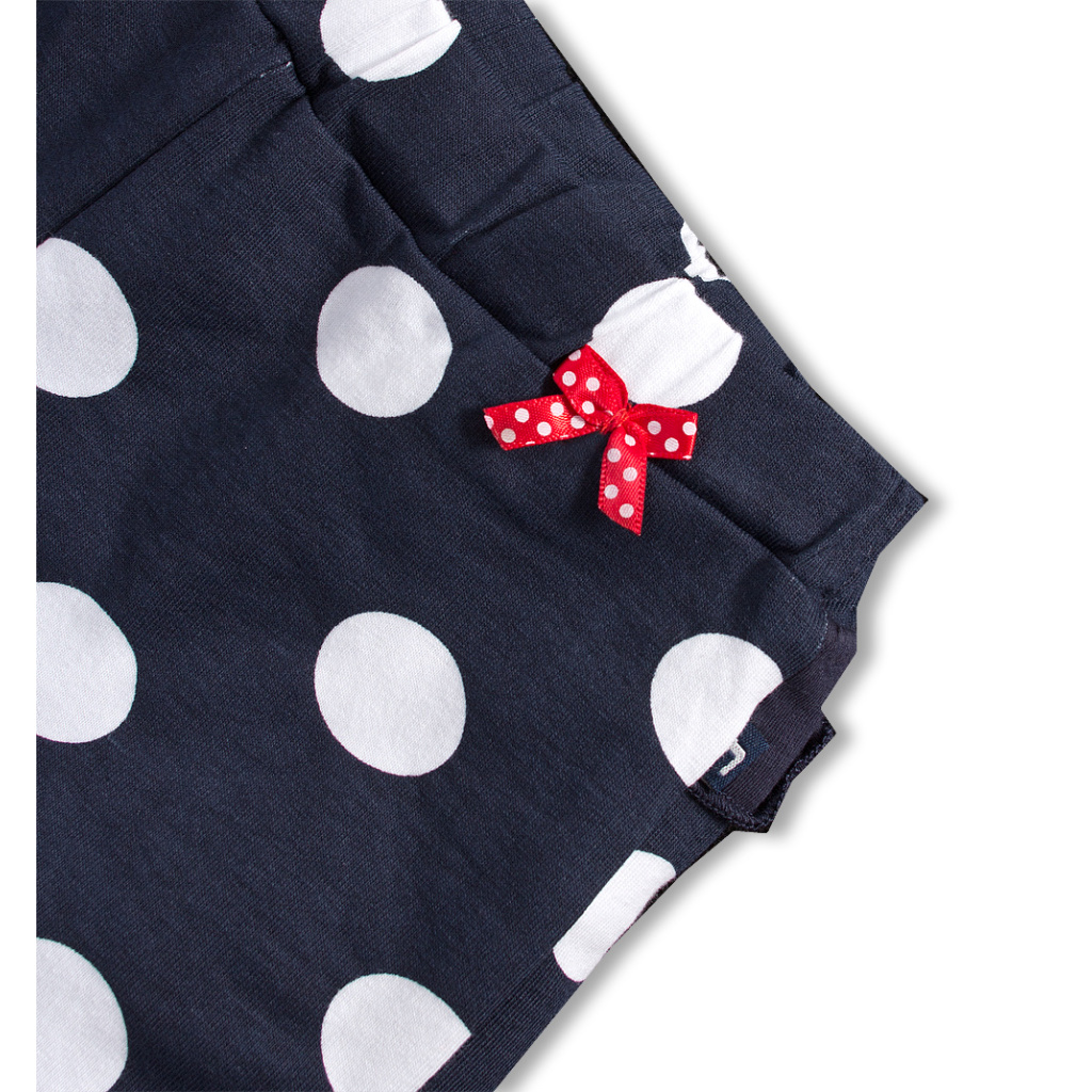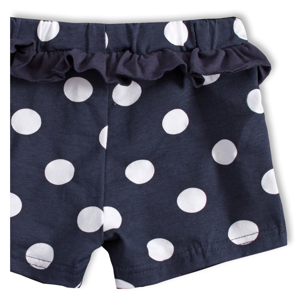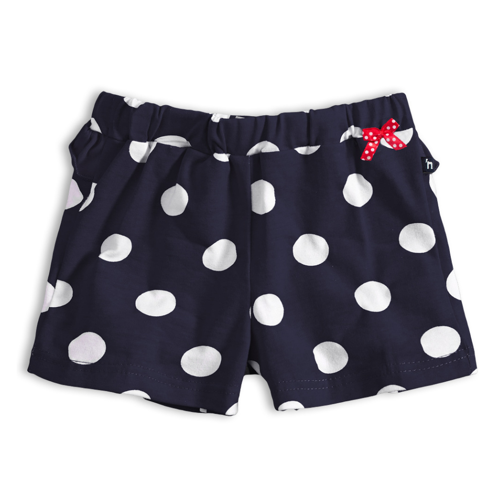 Krásný komplet pro holčičky. Tričko s potiskem, barevný lem u krku. Oblékání usnadňuje praktický knoflíček vzadu. Šortky z úpletu s potiskem puntíků. V pase na gumu. Vzadu našitý volánek, vepředu malá mašlička. Pružný materiál.Doplňkové parametry