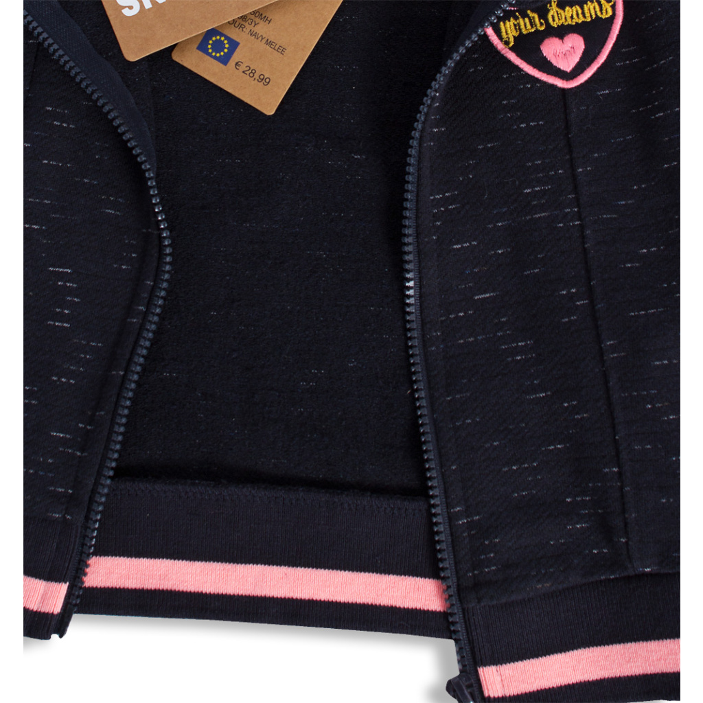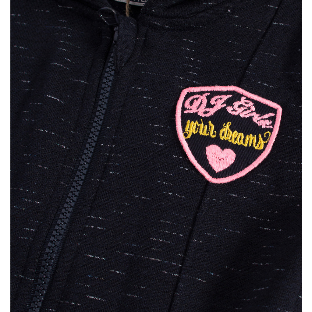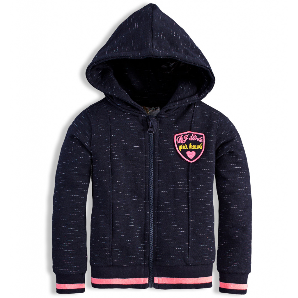 Rozepínací mikina pro holky. S kapucí. Vpředu nášivka. Pružné lemy. Silnější úplet, z rubu bez chloupku.