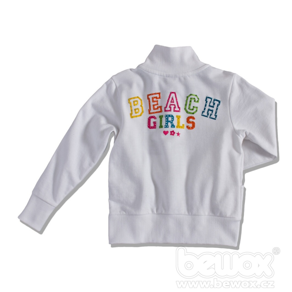 Dívčí mikina - u krku stojáček, kovový zip, kapsy. Vpředu malá výšivka, na zádech nápis. Teplákovina z rubu bez chloupku.