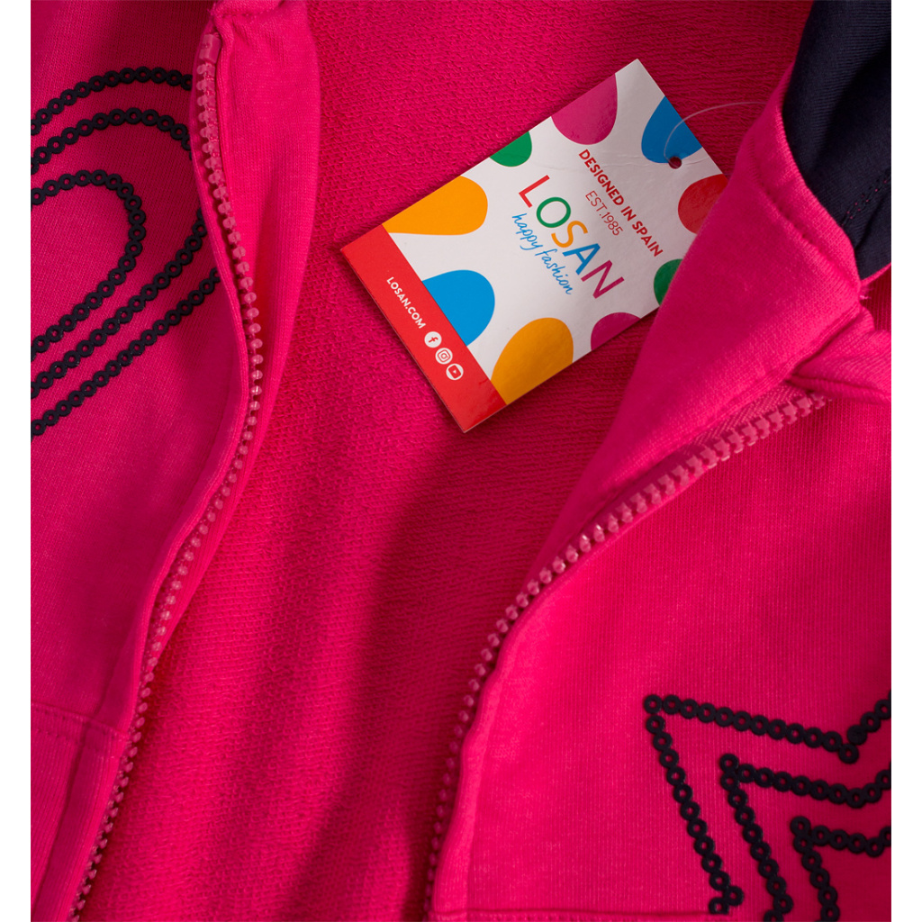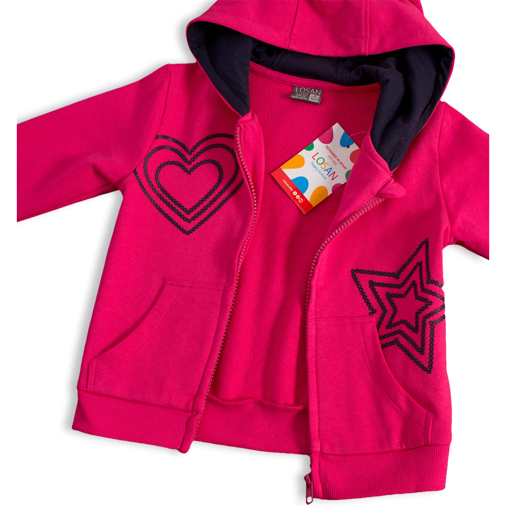 Dívčí mikina španělské značky Losan. Zapínání na zip. S kapucí. Vpředu našité kapsy. Plastická aplikace. Pružné lemy na rukávech i na spodním okraji. Teplákovina z rubu bez chloupku.