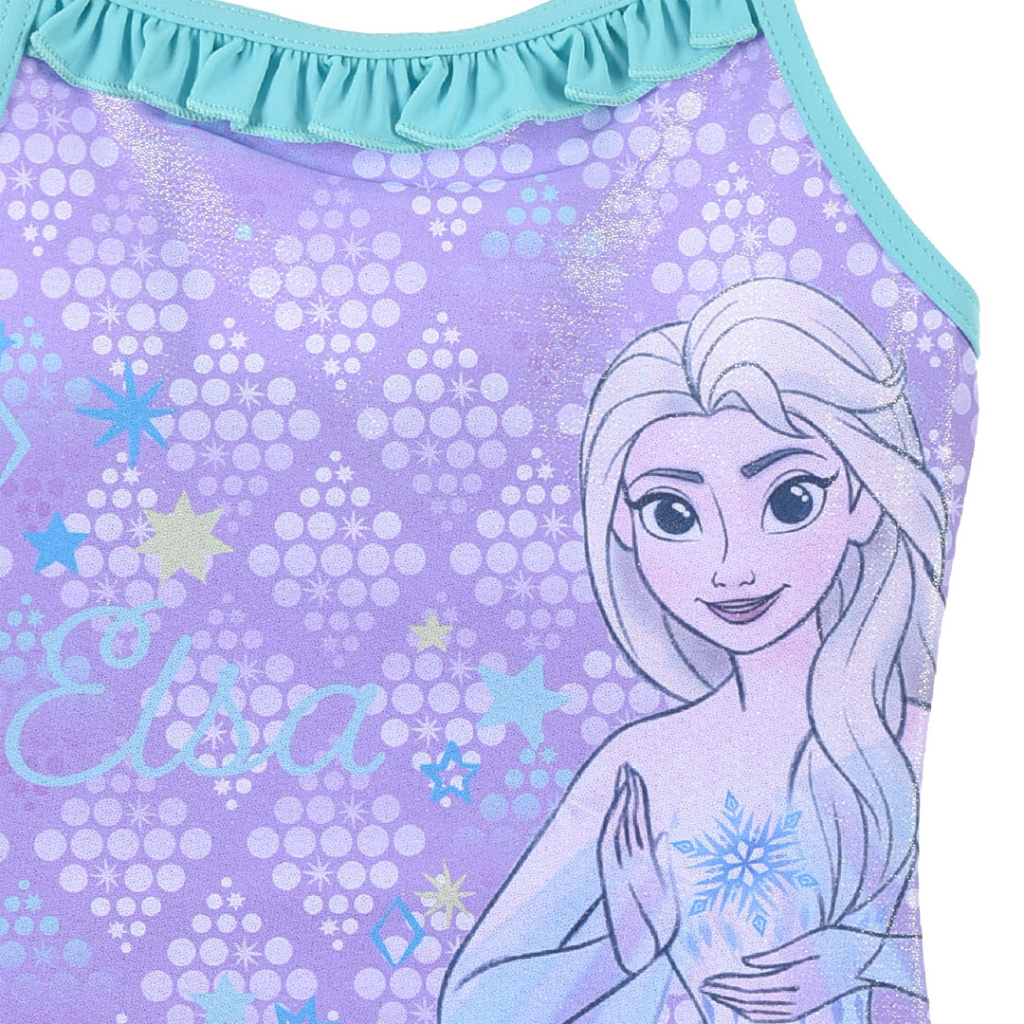 Jednodílné dívčí plavky s Elsou z Ledového království. Mírně třpytivý materiál, zdobené volánky.