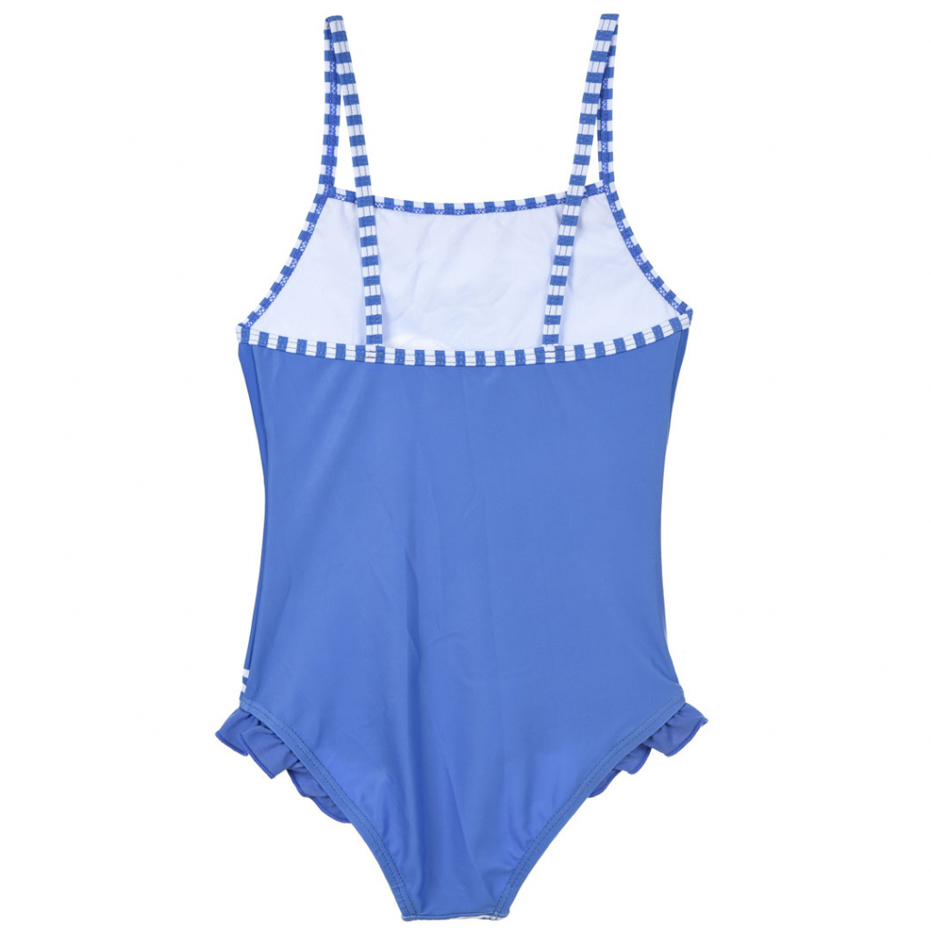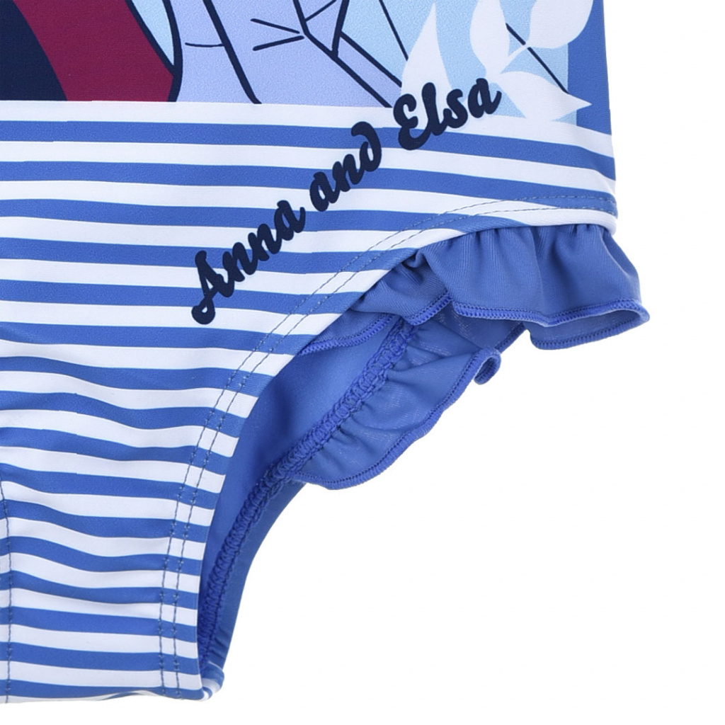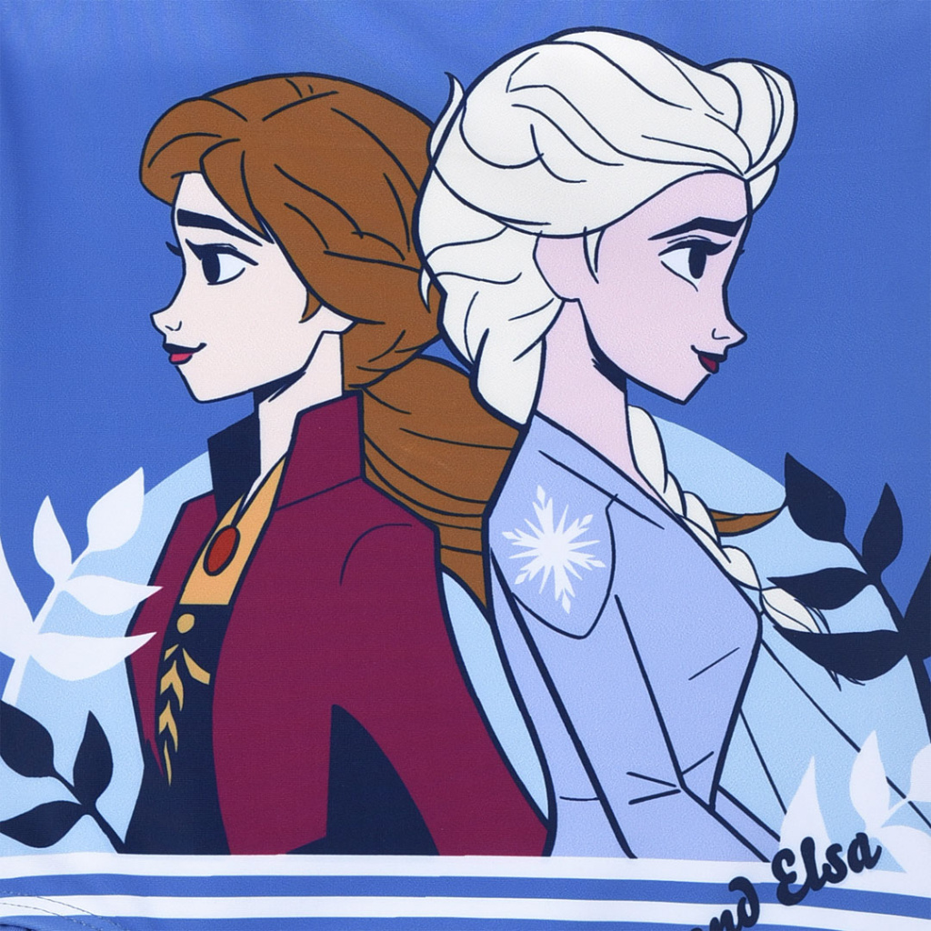 Dívčí jednodílné plavky s potiskem Anny a Elsy z Ledového království II. Nohavičky ukončeny volánky.