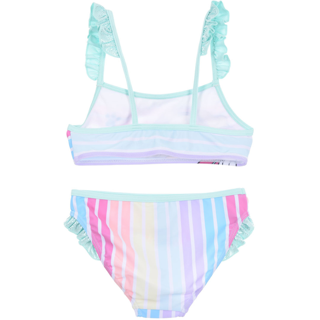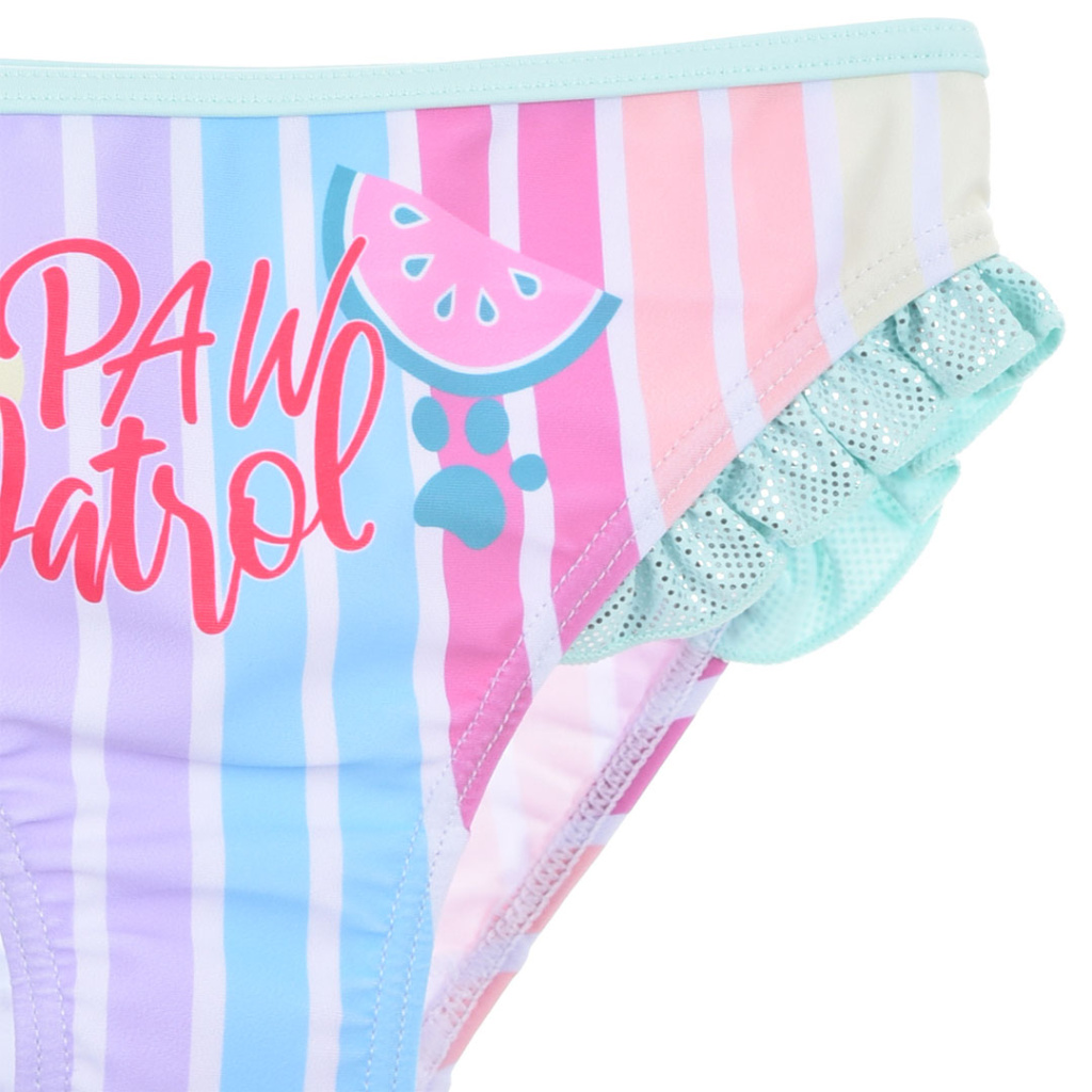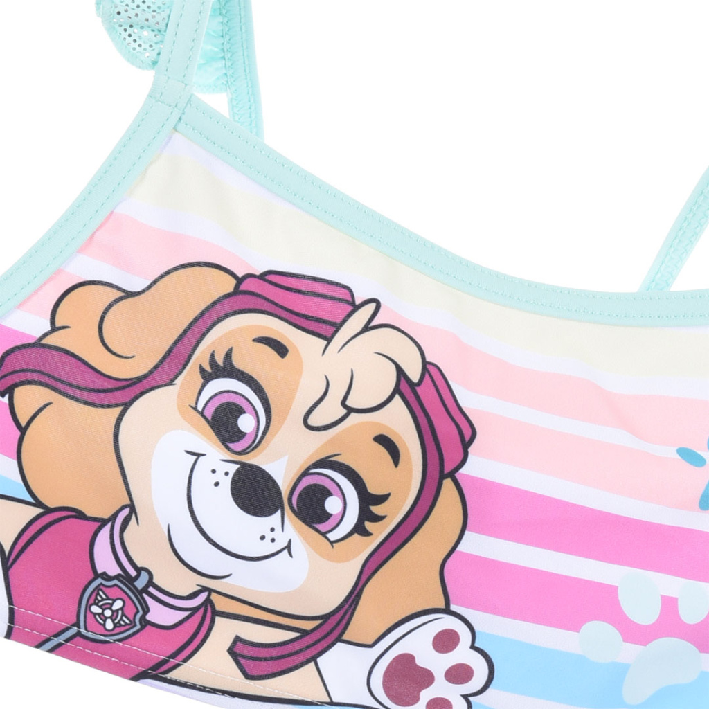 Dvoudílné dívčí plavky s barevnými proužky a obrázkem SKYE z Tlapkové patroly. Vrcní díl je bez zapínání.
