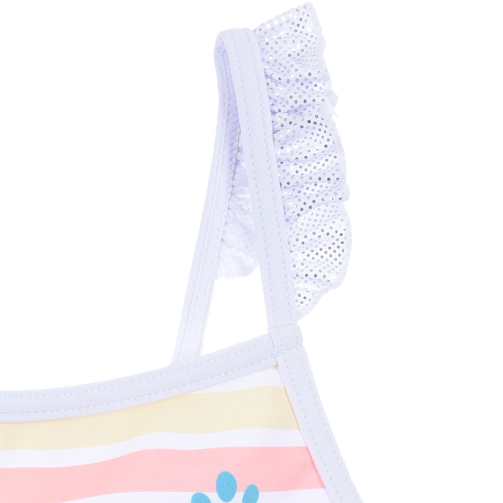 Dvoudílné dívčí plavky s barevnými proužky a obrázkem SKYE z Tlapkové patroly. Vrcní díl je bez zapínání.