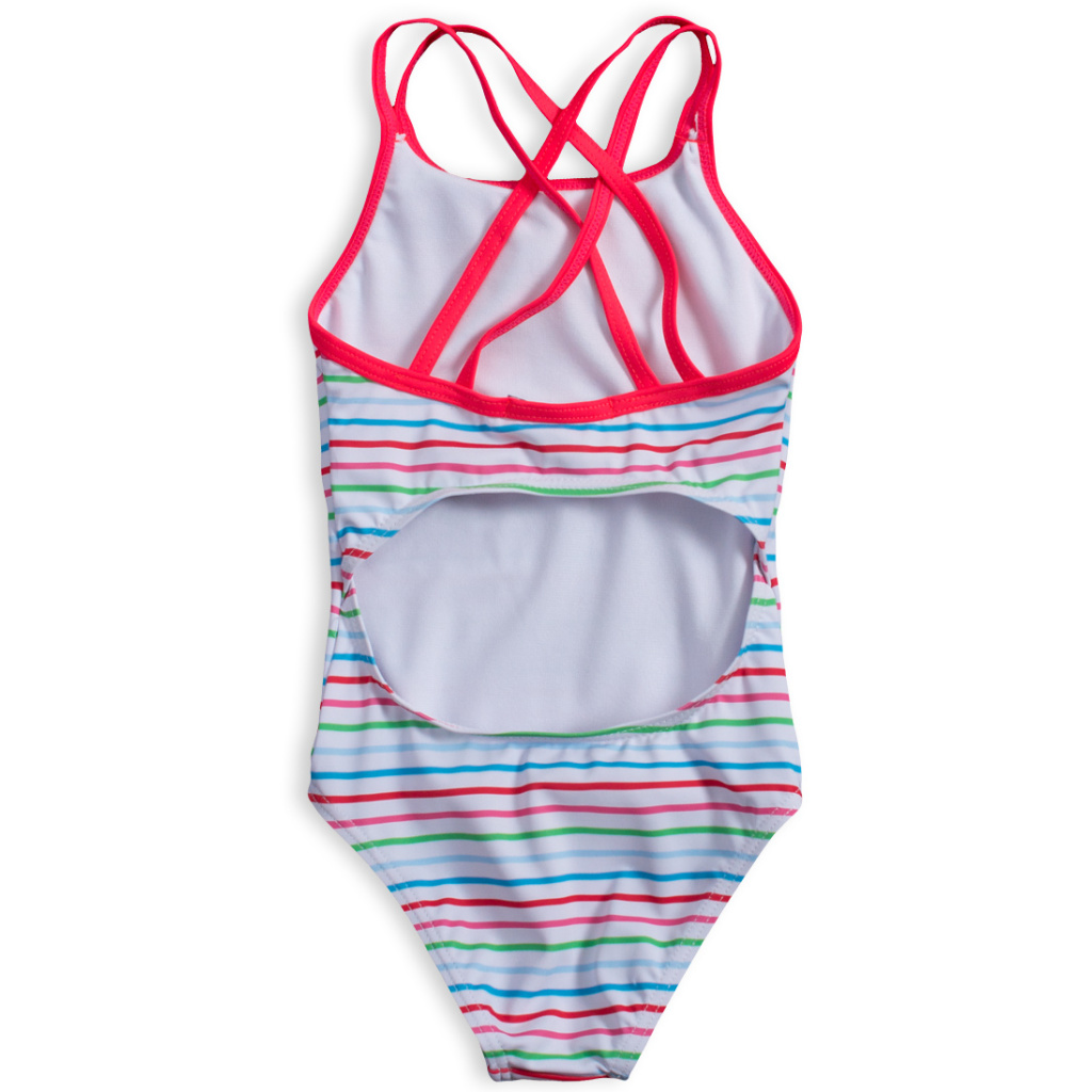 Dívčí jednodílné plavky. Barevné proužky na bílém podkladu. Dvojitá ramínka, na zádech zkřížená. Vzadu průstřih.