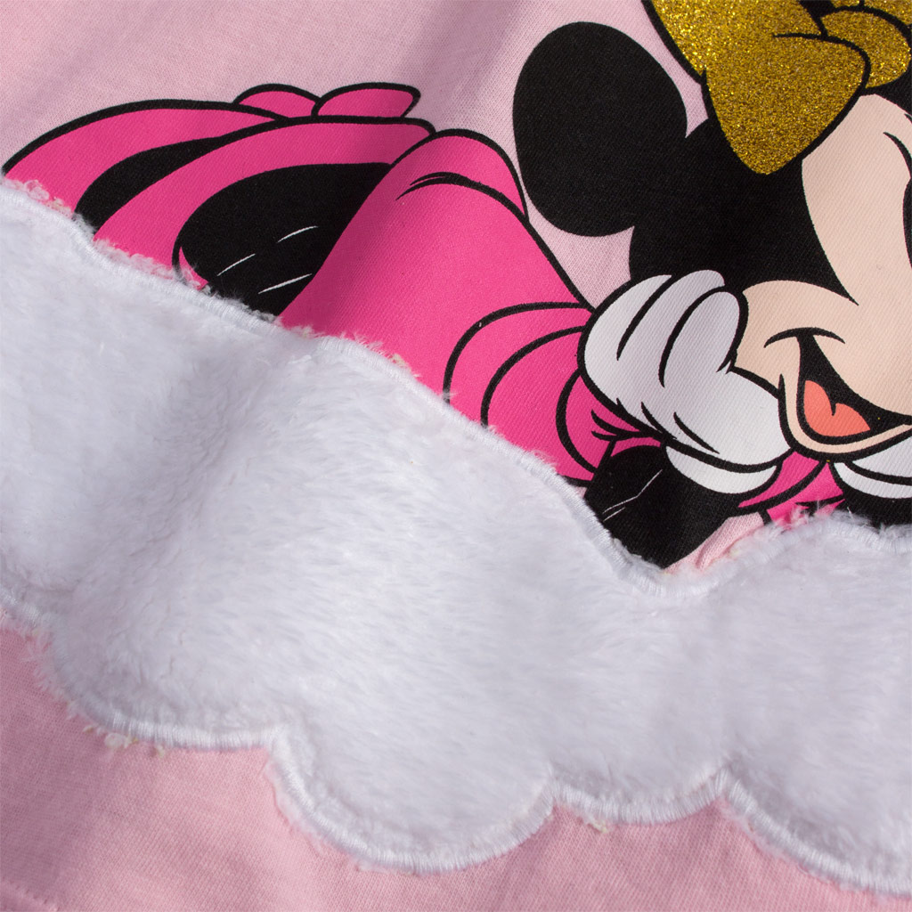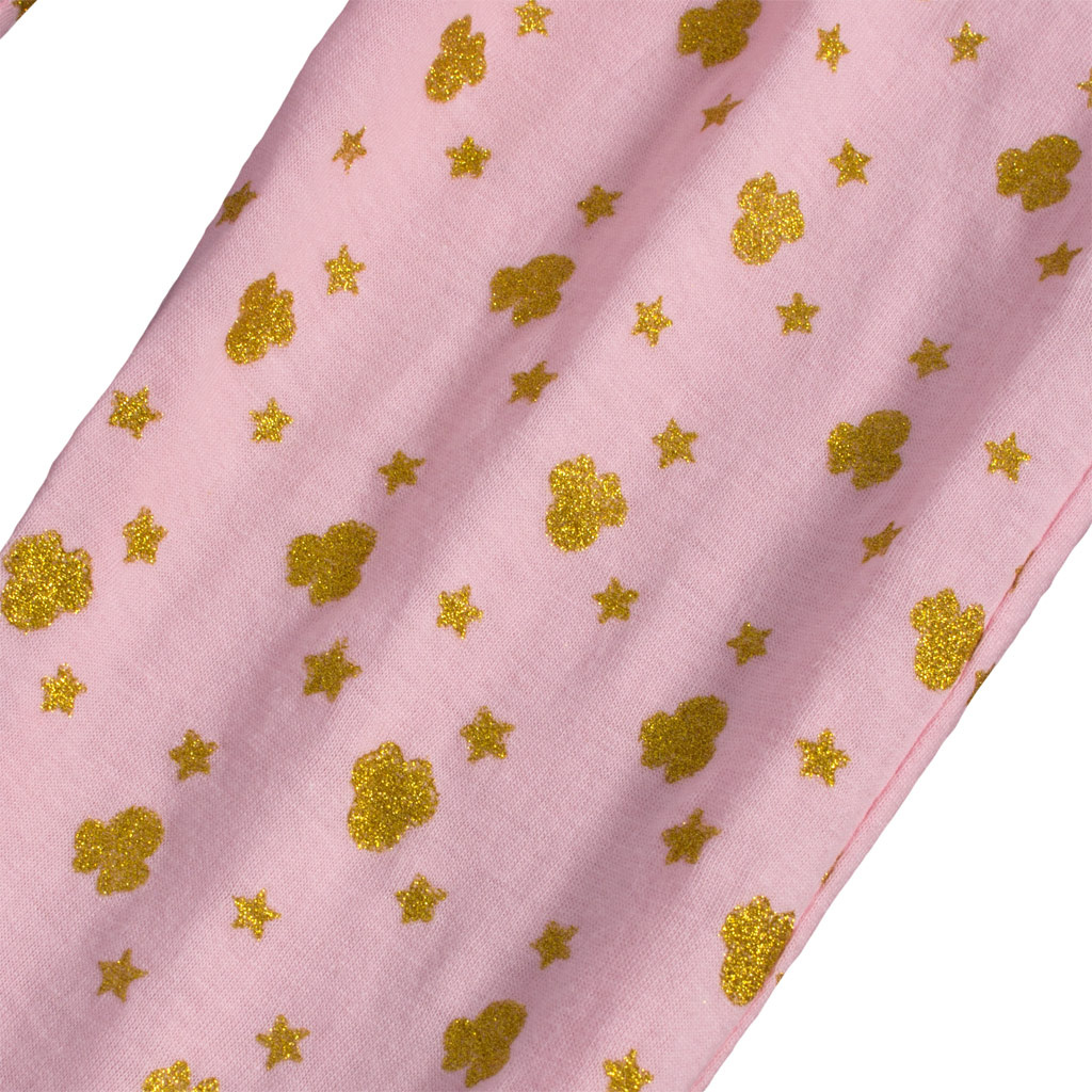Krásné a pohodlné pyžamko pro holčičky. Myška Minnie na heboučkém, chlupatém obláčku. Kalhoty s drobným zlatým potiskem. Dlouhý rukáv i nohavice. Příjemný bavlněný úplet.