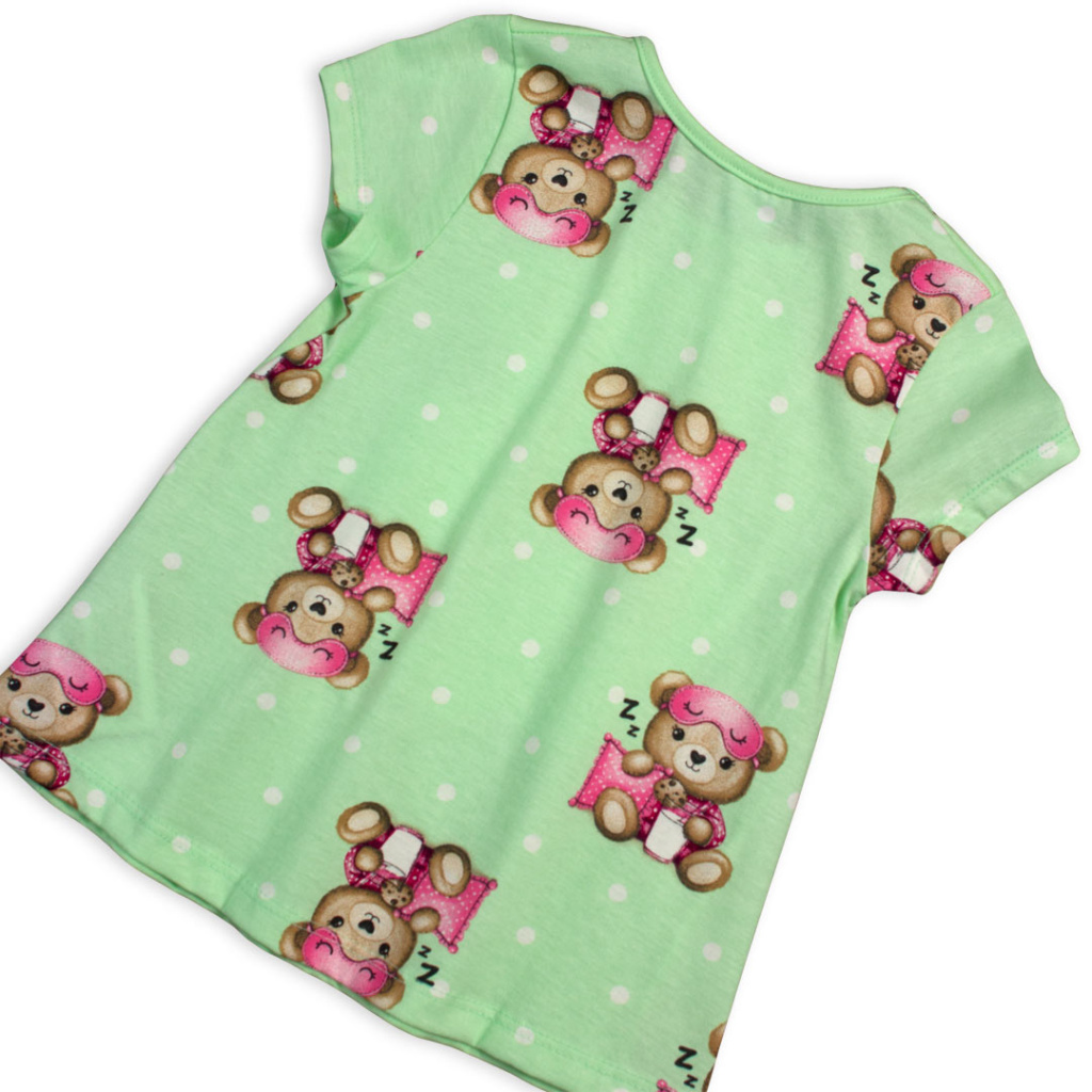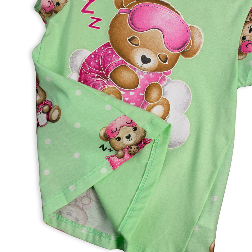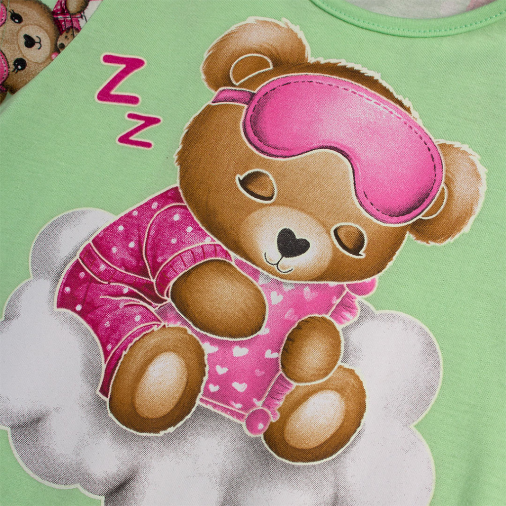 Dívčí pyžamo s medvídkem. Obrysy obrázku na tričku ve tmě svítí. Pohodlný střih, tričko mírně rozšířené. Bavlněný úplet. Vyrobeno v Brazílii.