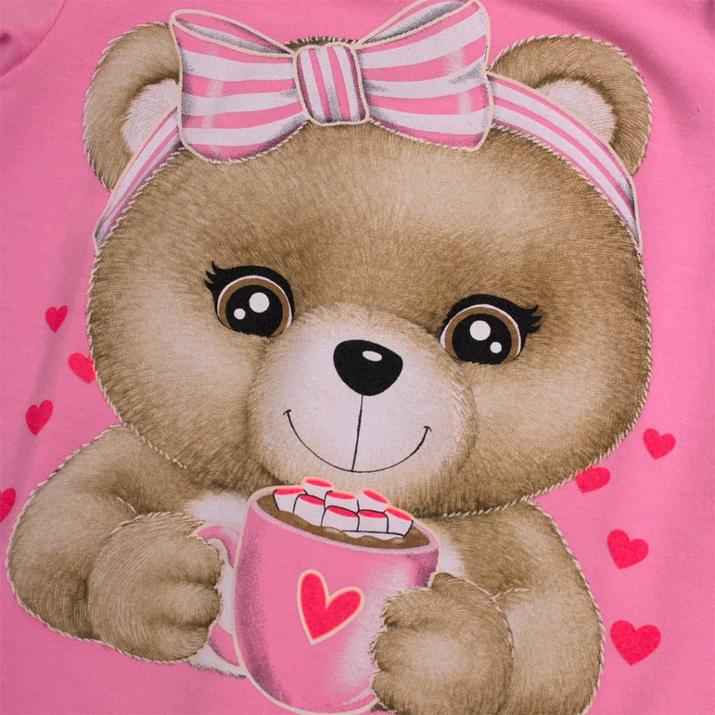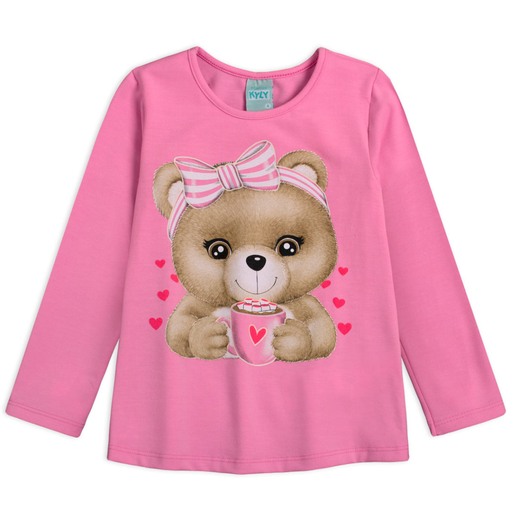 Dívčí pyžamo s obrázkem. Tričko s dlouhým rukávem, mírně rozšířený střih. Obrázek medvídka ve tmě svítí.. Pohodlné kalhoty v pase na gumu. Příjemný materiál. Vyrobeno v Brazílii.