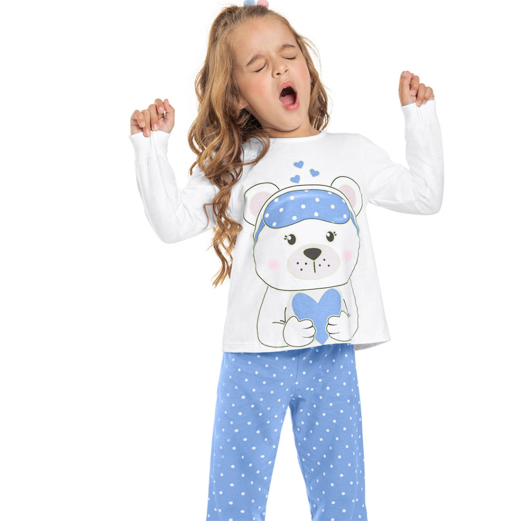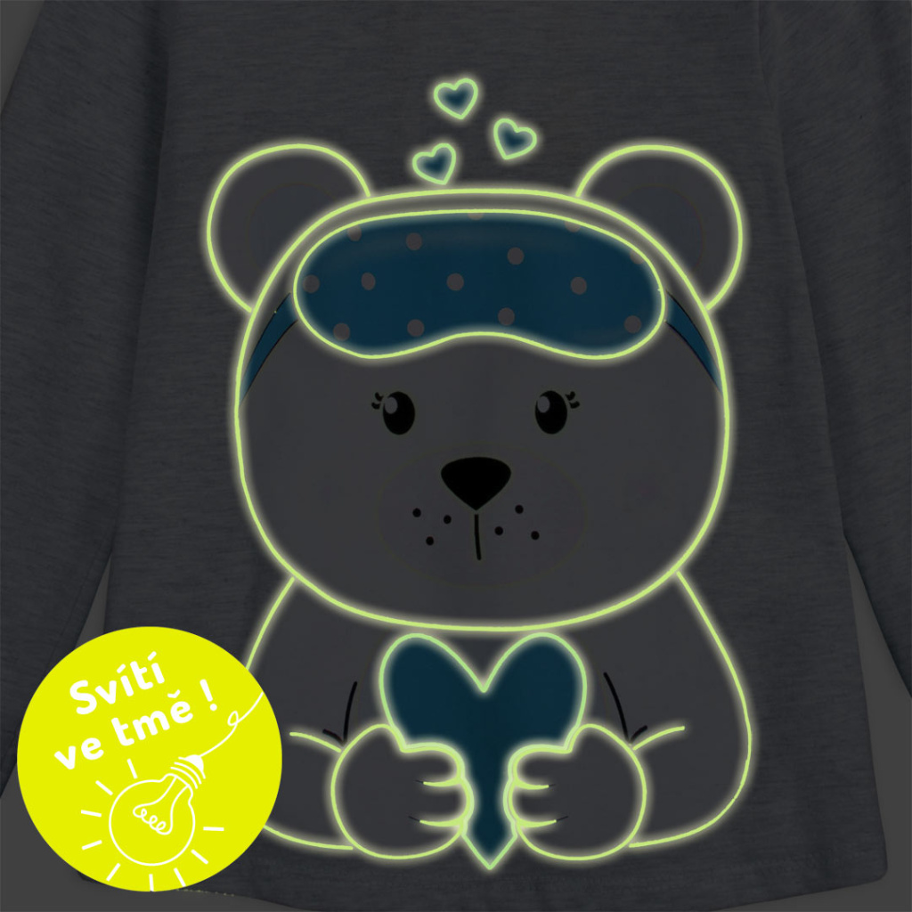 Dívčí pyžamo s velkým obrázkem medvídka, který svítí ve tmě. Pohodlný střih, pružné lemy na rukávech i nohavicích. Měkký bavlněný úplet. Vyrobeno v Brazílii.