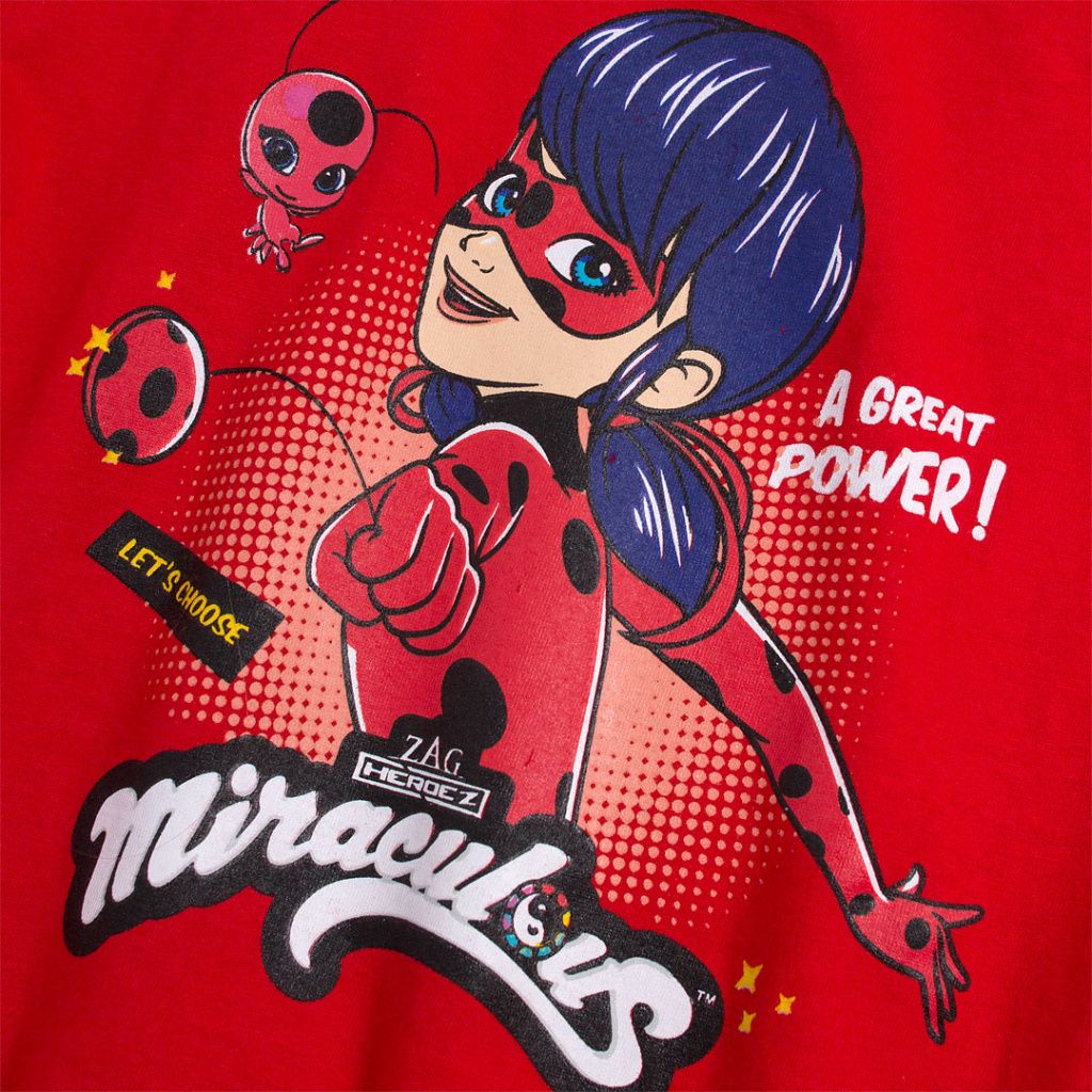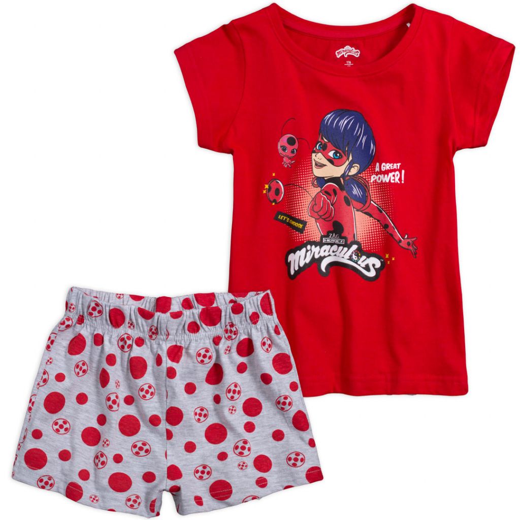 Dívčí pyžamo s Kouzelnou beruškou. Tričko s krátkým rukávem, s barevným obrázkem. Šortky s pohodlnou gumou v pase, s puntíky. Příjemný, měkký úplet.