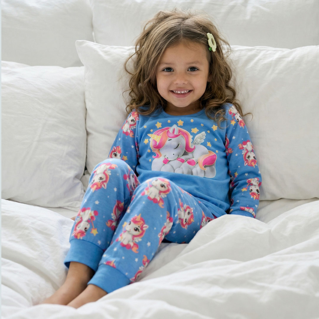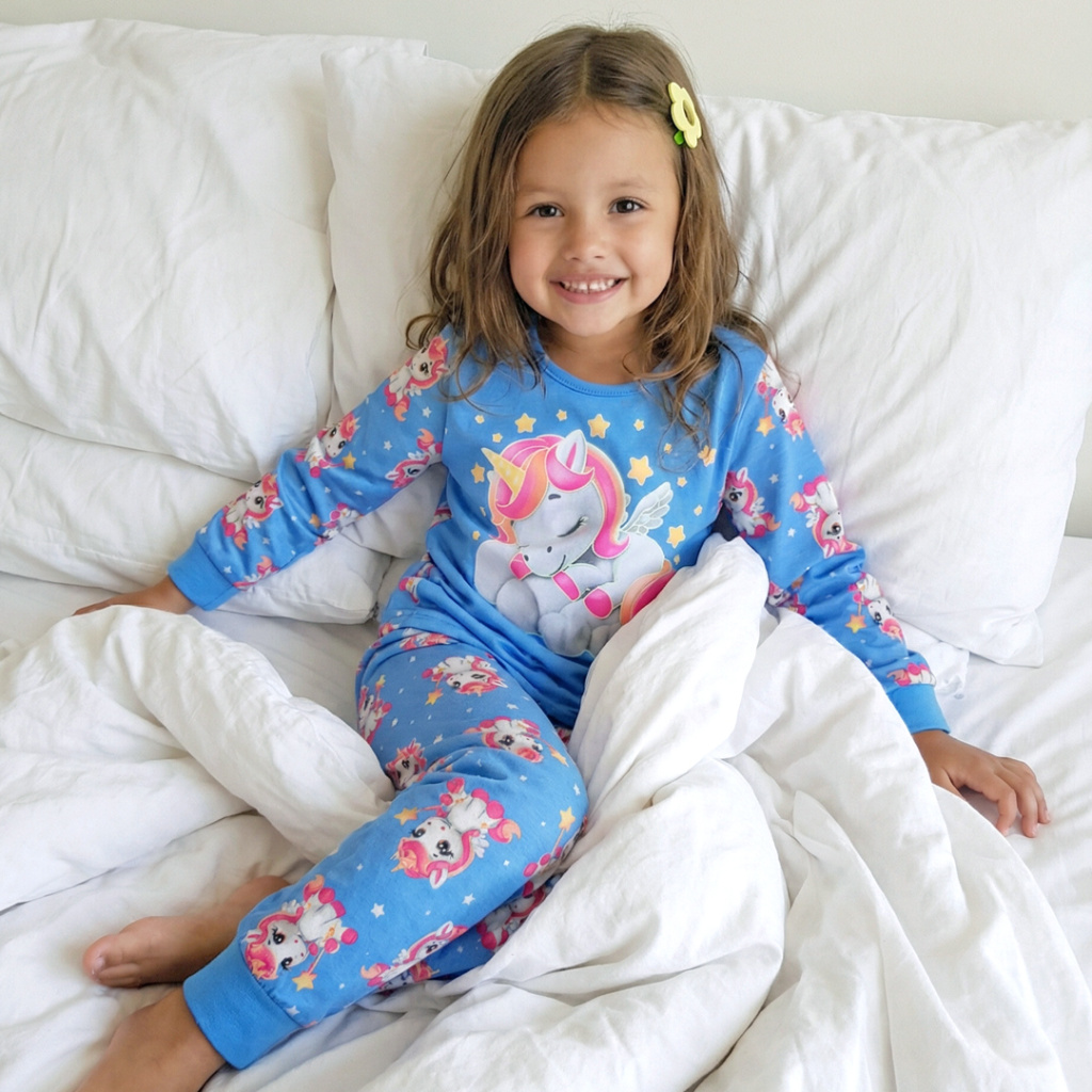 Dívčí pyžamko s roztomilým obrázkem spícího kouzelného jednorožce. Pohodlný střih, pružné lemy. Obrysy obrázku na tričku ve tmě svítí. Vyrobeno v Brazílii.