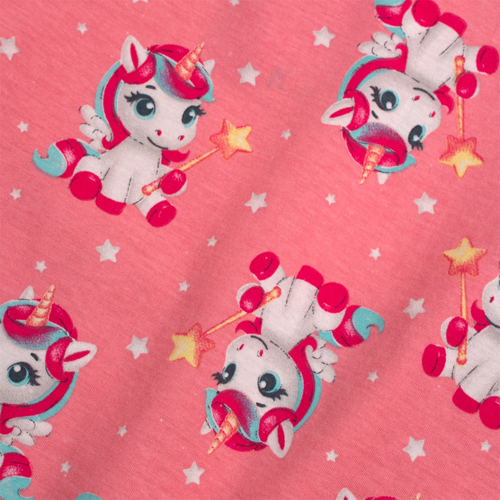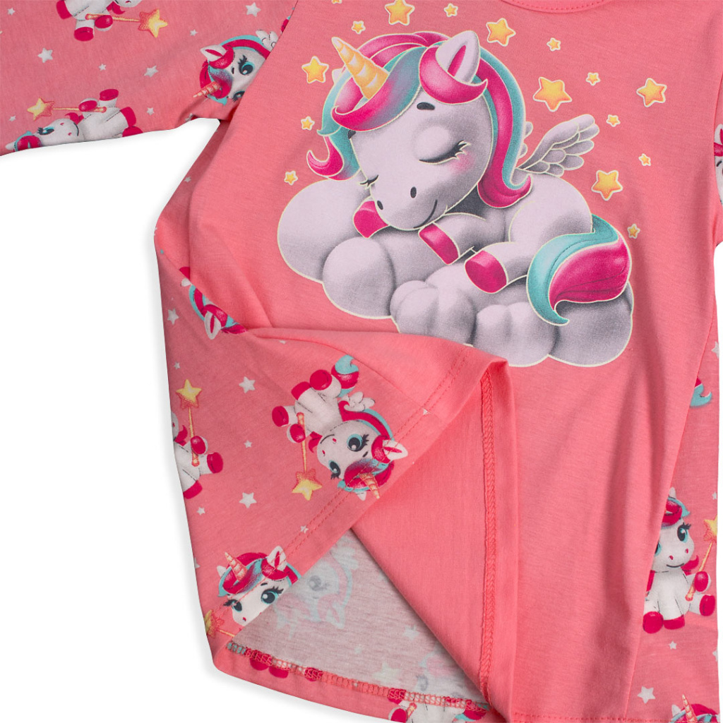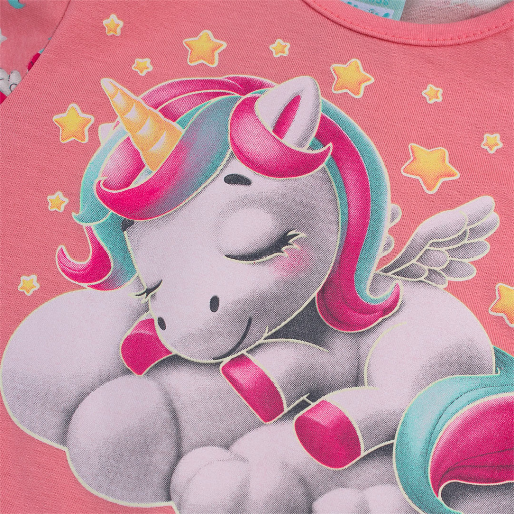 Dívčí pyžamko s roztomilým obrázkem spícího kouzelného jednorožce. Pohodlný střih, pružné lemy. Obrysy obrázku na tričku ve tmě svítí.