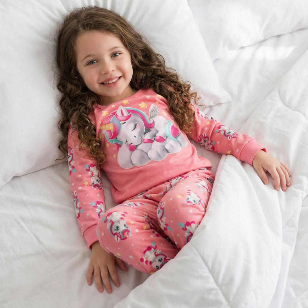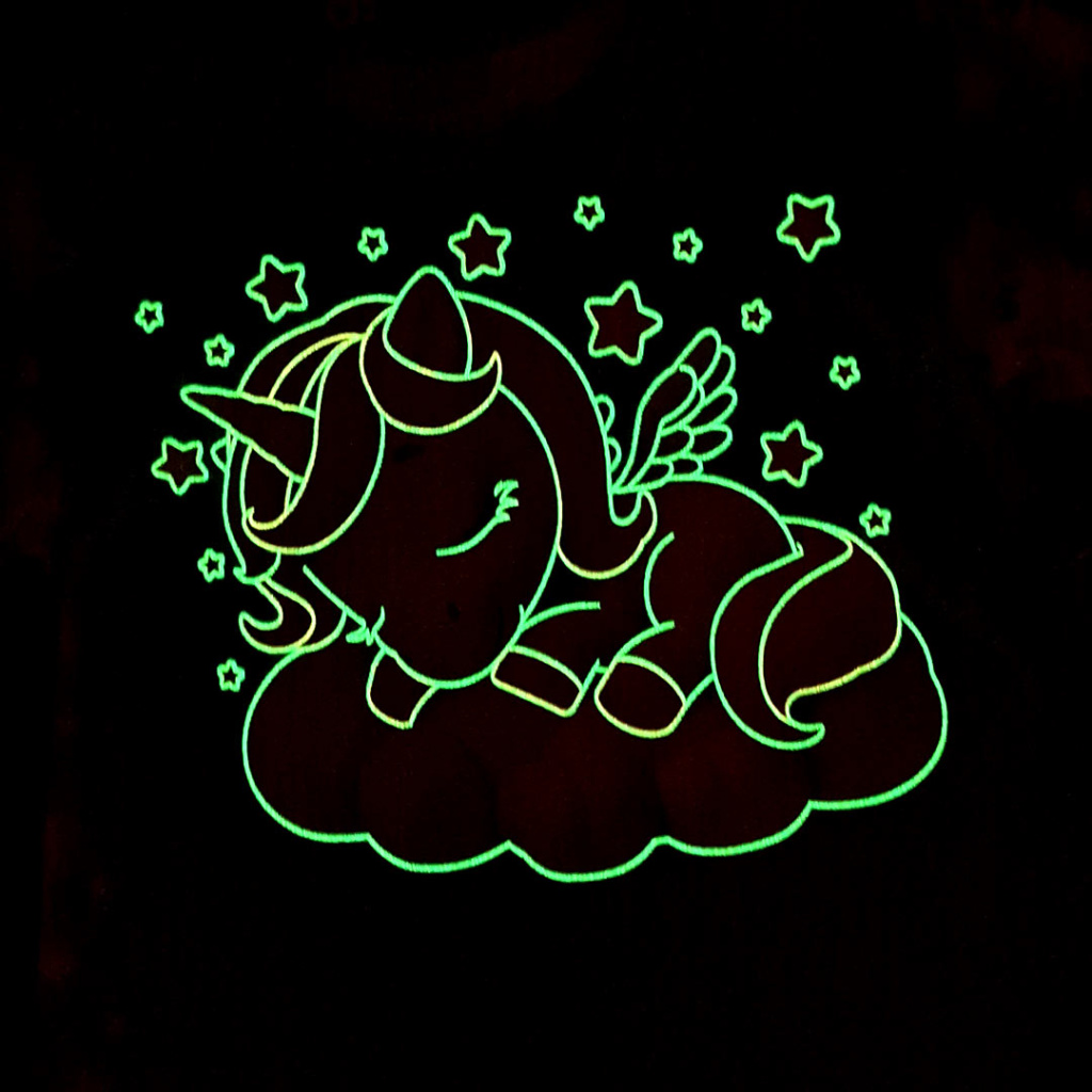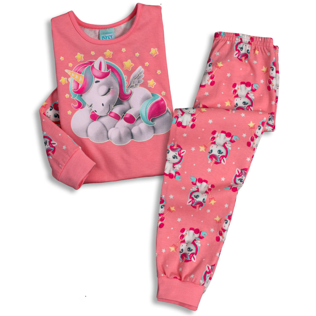 Dívčí pyžamko s roztomilým obrázkem spícího kouzelného jednorožce. Pohodlný střih, pružné lemy. Obrysy obrázku na tričku ve tmě svítí.
