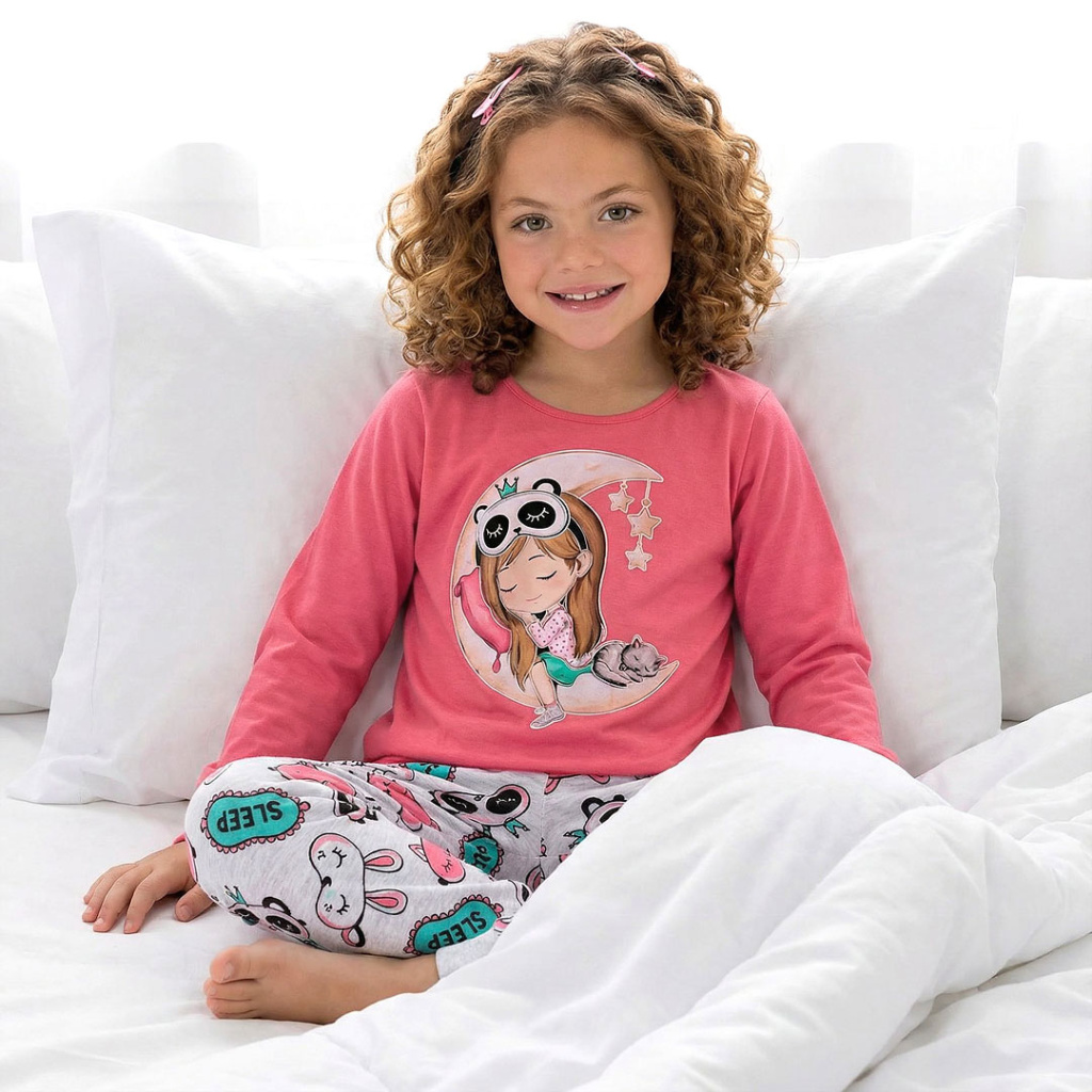 Klidné večery začínají tím správným pyžamem. Toto měkoučké dívčí pyžamo je navržené tak, aby se v něm vaše malá slečna cítila pohodlně, volně a bezpečně. Tričko s jemně rozšířeným střihem a pružnými lemy neškrtí ani netlačí, a měkký bavlněný úplet zaručuje příjemný pocit pohodlí po celou noc.