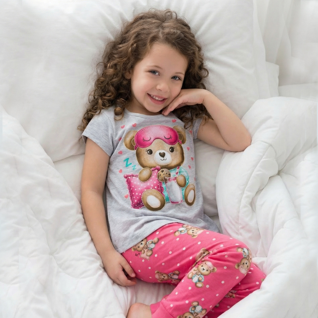 Krásné dívčí pyžamko. Tričko s krátkým rukávem, obrysy obrázku ve tmě svítí. Kalhoty s dlouhými nohavicemi, s pružnými náplety. Příjemný bavlněný úplet. Vyrobeno v Brazílii.