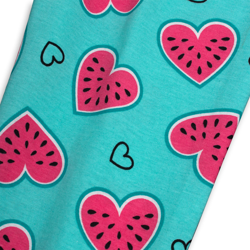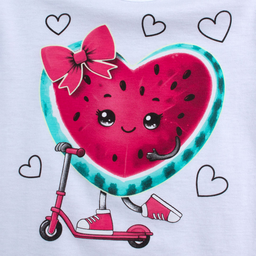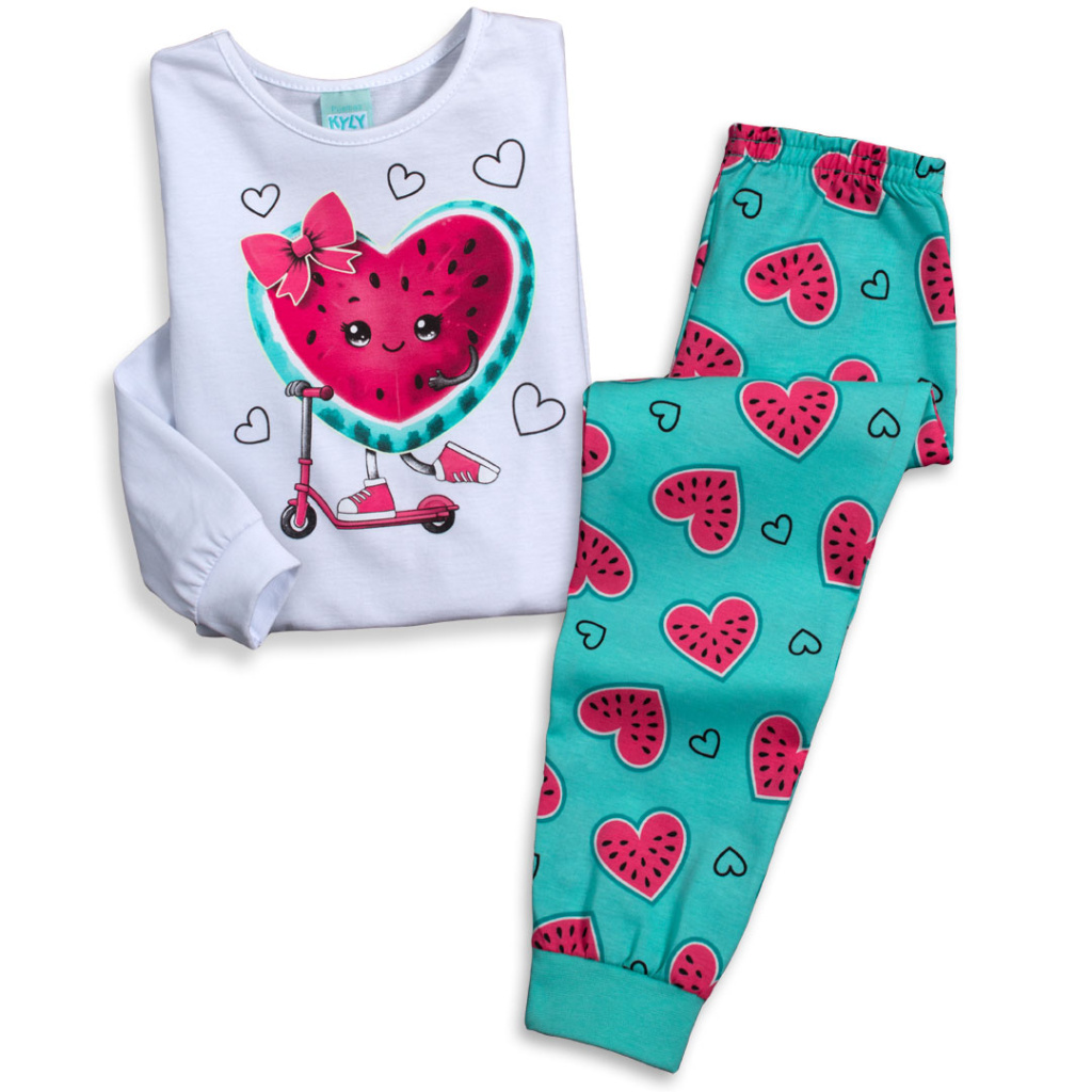 Dívčí pyžamo s veselým potiskem melounových srdíček. Obrysy obrázku na tričku ve tmě svítí. Rukávy i nohavice s pružnými náplety. Bavlněný úplet. Vyrobeno v Brazílii.