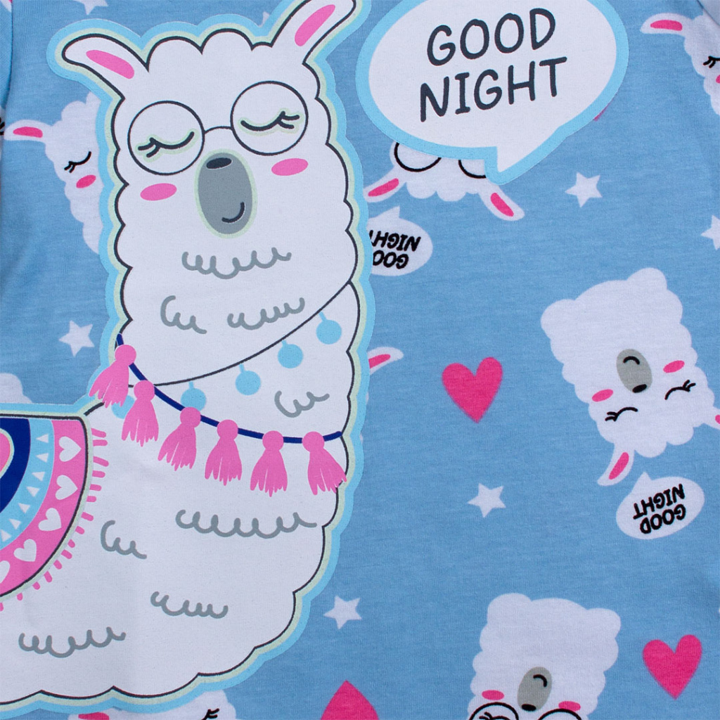 Dívčí pyžamo s roztomilou lamou. Obrys velkého obrázku na tričku ve tmě svítí. Měkký, pohodlný, bavlněný úplet. Vyrobeno v Brazílii.