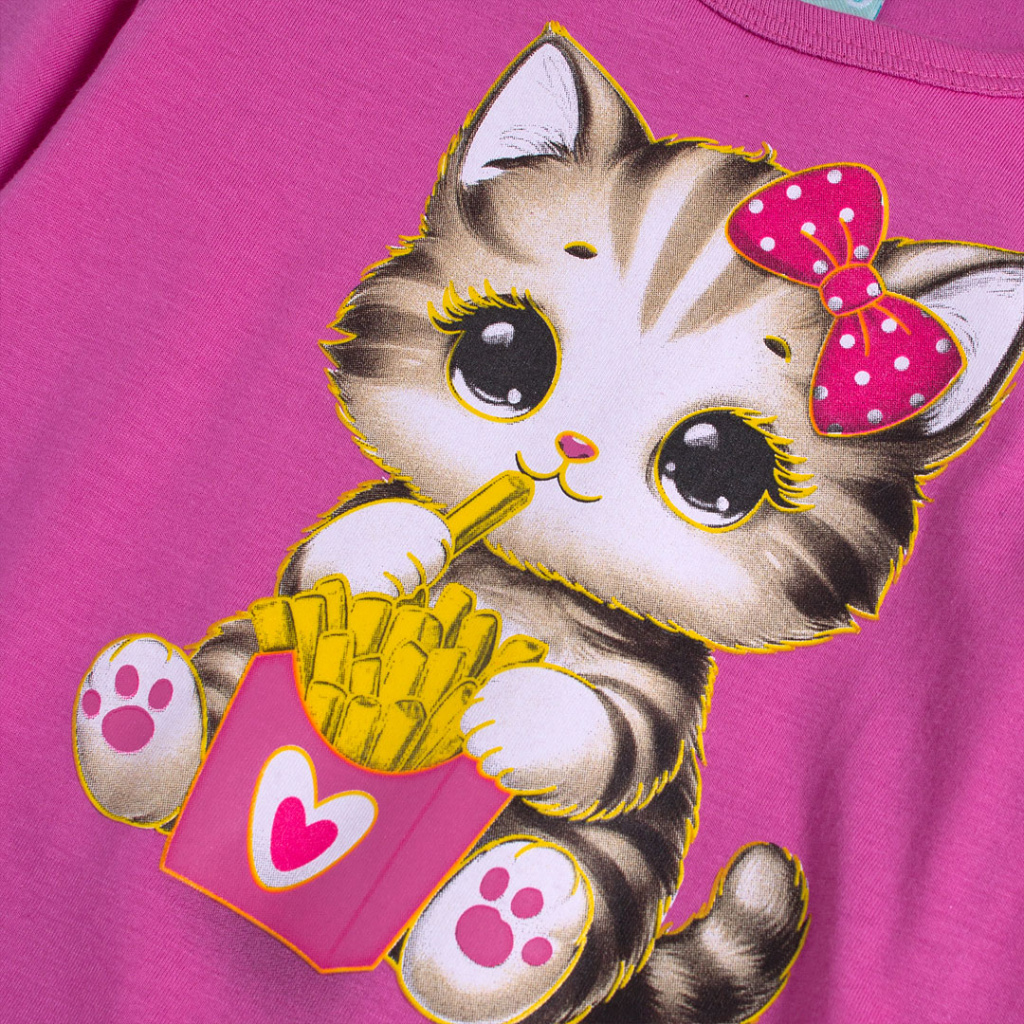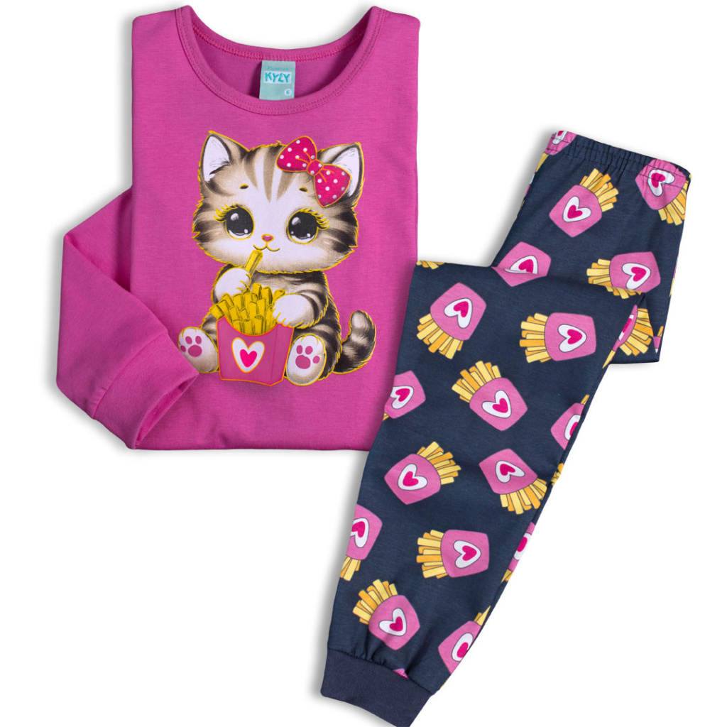 Krásné dívčí pyžamo s kočičkou. Obrysy obrázku na tričku ve tmě svítí. Bavlněný úplet. Vyrobeno v Brazílii.