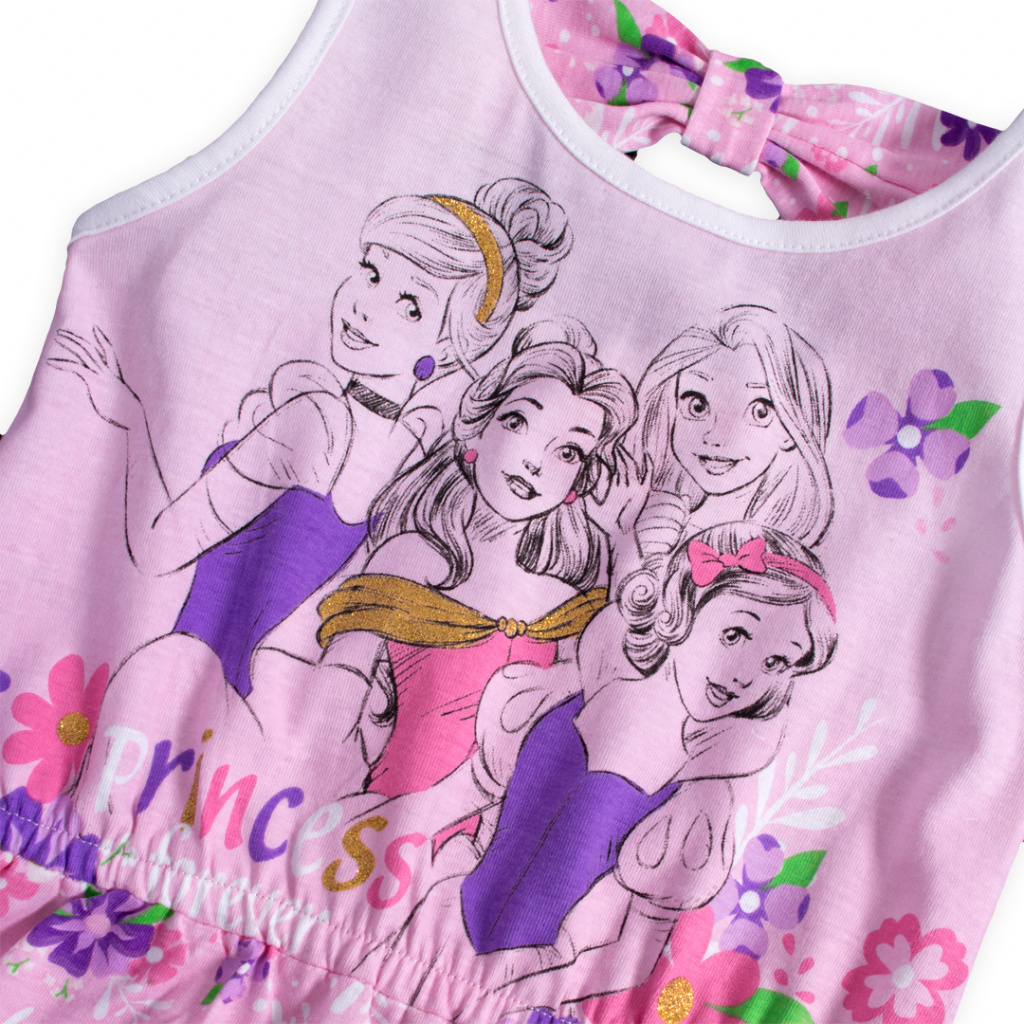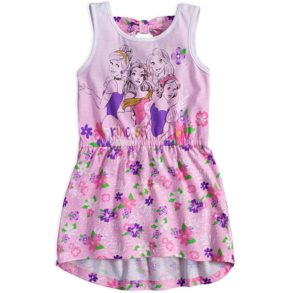 Letní šaty pro holčičky. Licenční potisk Disney princezen. Bez rukávů, v pase guma. Zadní díl do oblouku. Lehký a příjemný úplet.