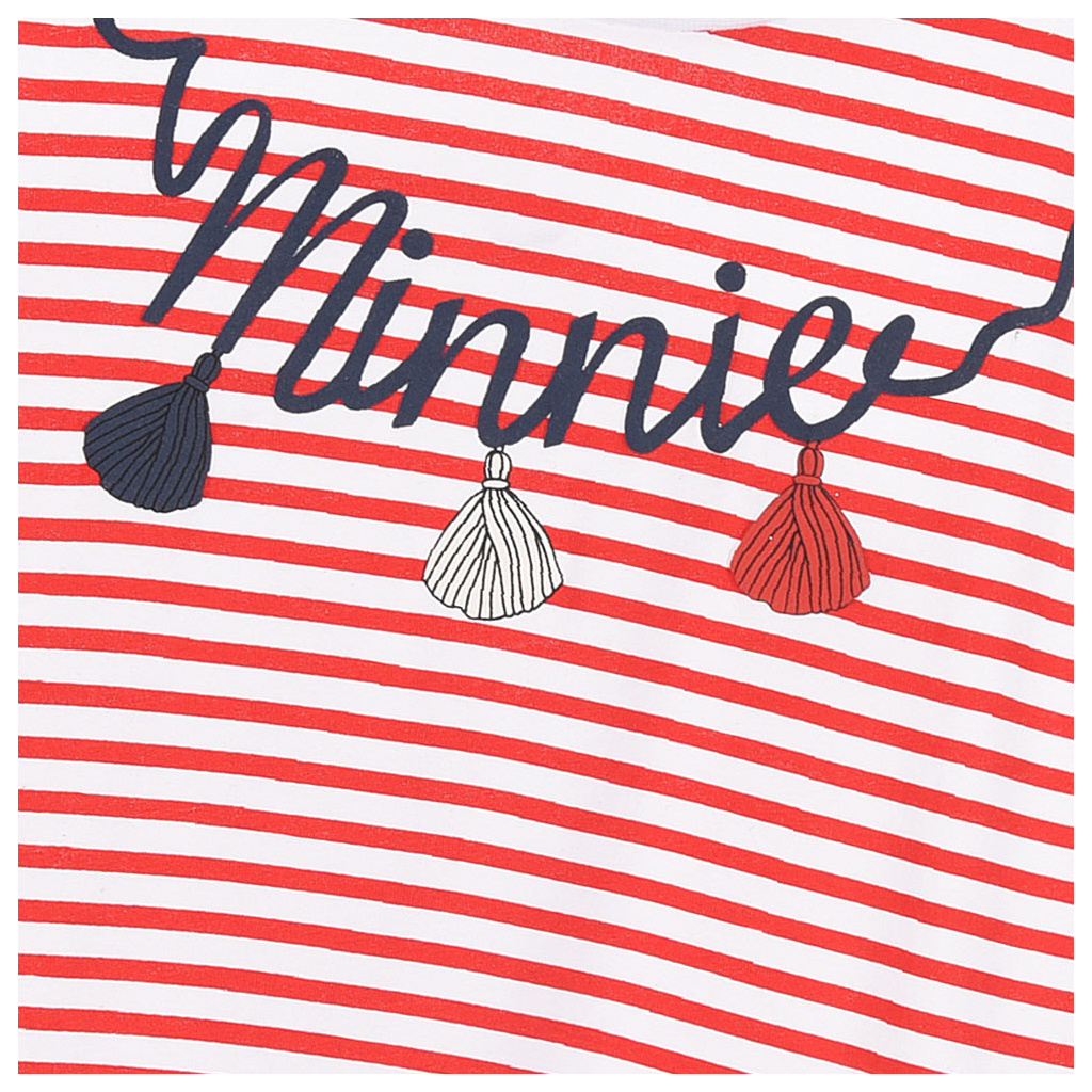 Dívčí šaty s Minnie v námořnickém stylu. S nápisem, našitou aplikací a mašlí. Příjemný bavlněný úplet.
